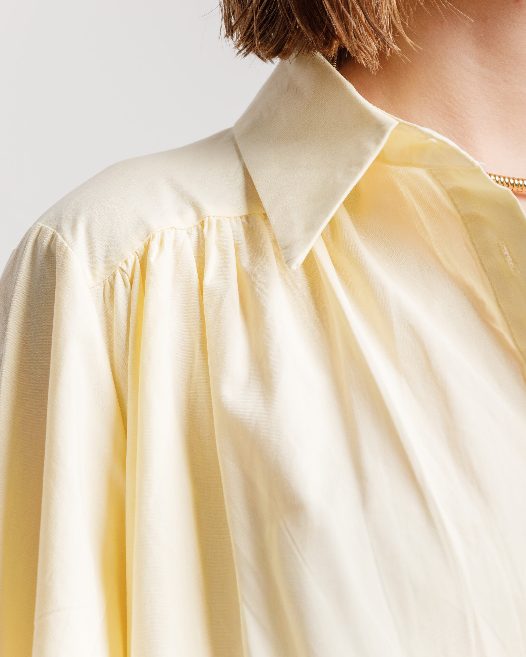 Abito corto modello chemisier in cotone, manica lunga con polsino, colletto a revers con bottoncini, modello ampio con balze. Non elastico