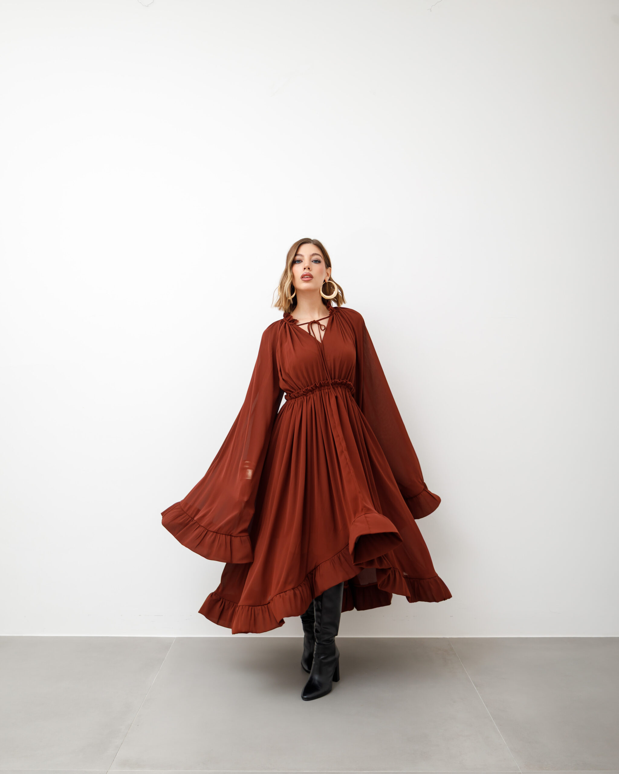 Abito lungo in georgette leggera, manica lunga molto ampia a campana con apertura sia su spalla che sulla parte sottotostante, scollo a v, con colletto elastico regolabile mediante laccetti e rouches. Punto vita elastico, ampia gonna fluida,lunghezza asimmetrica con balza su orlo. Non elastico