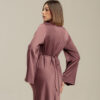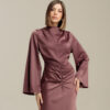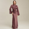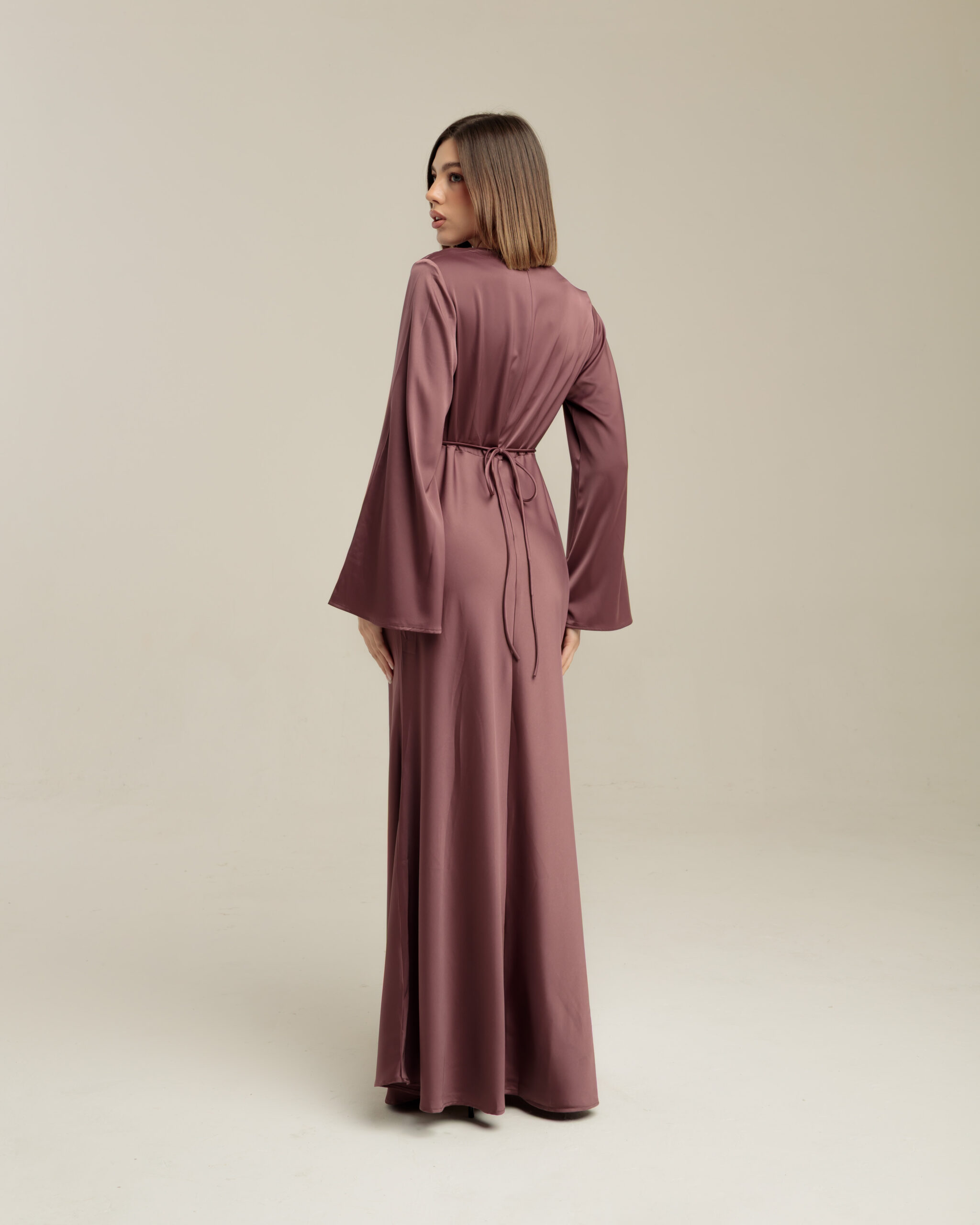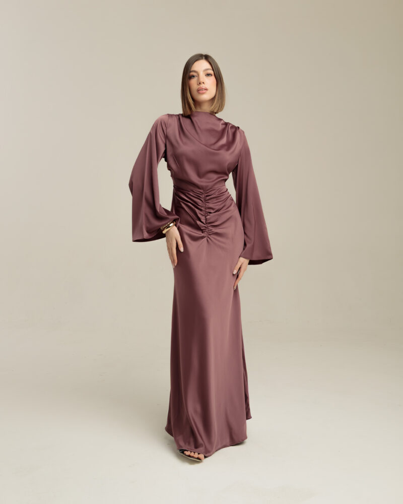 Abito lungo in simil seta, manica lunga ampia, colletto alto, riprese su spalla, punto vita segnato con bustino arricciato con laccetto da annodare sul retro, gonna lunga, svasata su orlo, chiusura con zip invisibile sul retro, non elastico