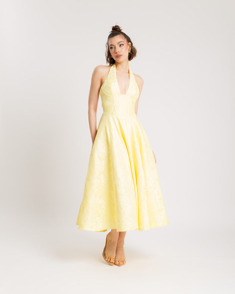 Abito midi in tessuto strutturato con lavorazione tono su tono. Il corpetto aderente con scollo profondo e allacciatura halter valorizza il décolleté e definisce il punto vita, stringhe sul retro regolabili. Gonna ampia, a ruota che crea volume e movimento, chiusura sul retro con zip, poco elastico