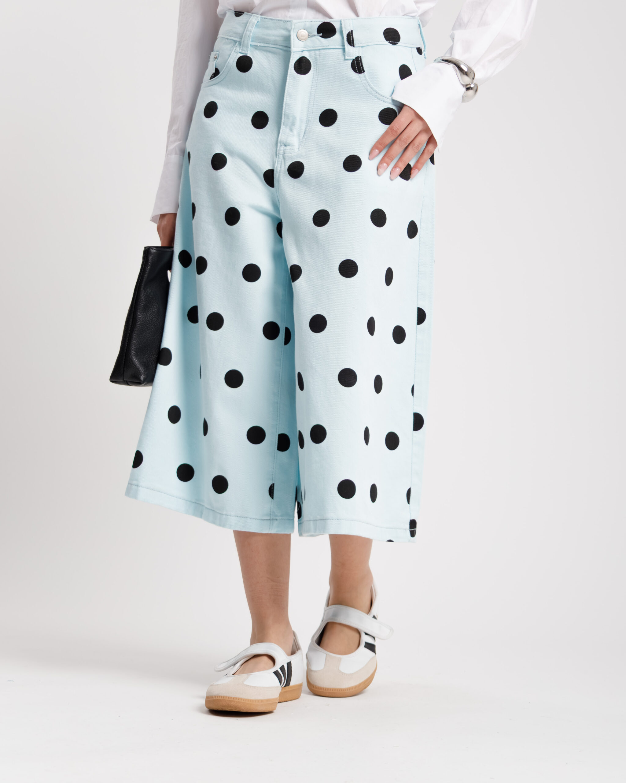 Bermuda in denim, vita media, gamba ampia, stampa a pois, lavaggio azzurro, chiusura frontale con bottone metallico e zip. Non elastico