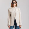 Blazer sartoriale manica lunga, con collo alto, con apertura frontale e bottone su collo,trama tartan tasche a filetto anteriori, foderata, chiusura con bottone. Non elastica.