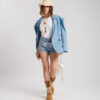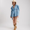 Blazer in denim, manica lunga, spallina strutturata e imbottita, colletto a revers, tasche finte con patta su orlo, cintura in vita estraibile, chiusura doppiopetto, sfoderata, non elastica