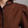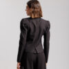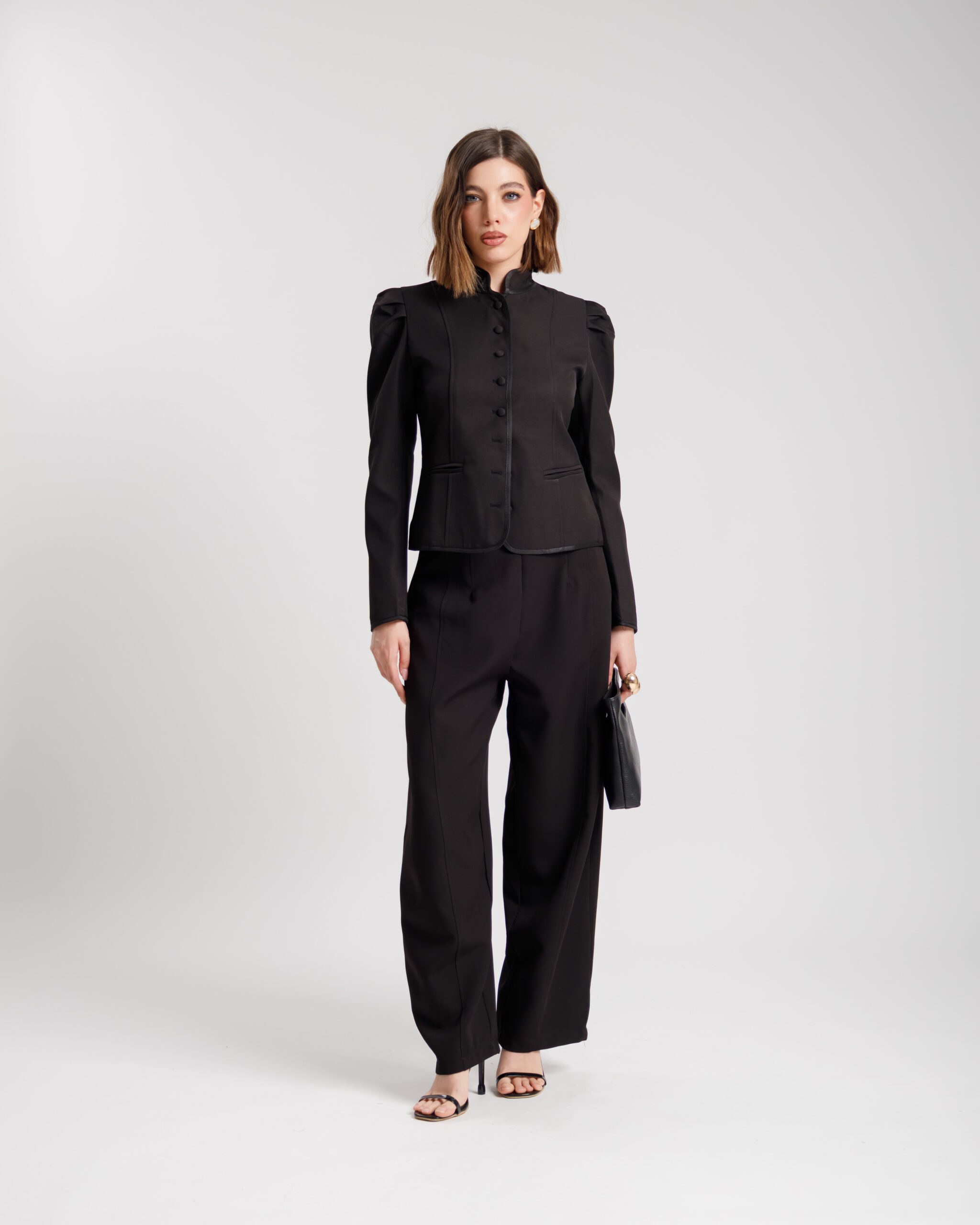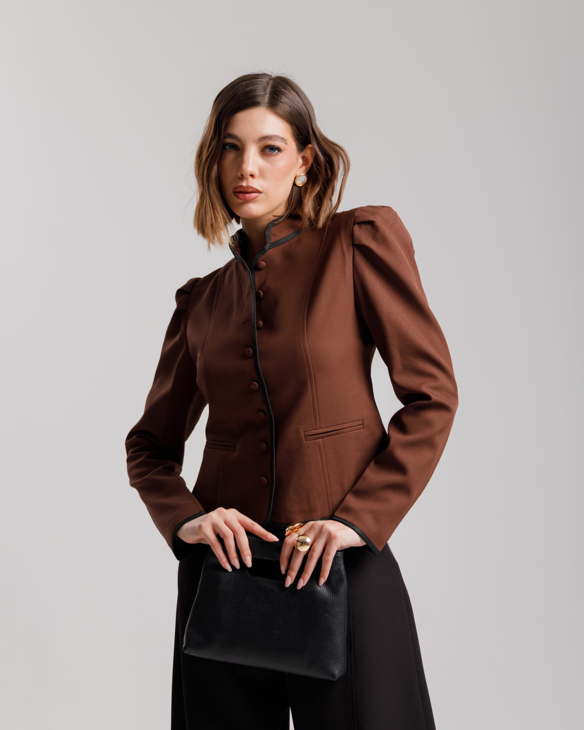 Blazer in misto cotone, manica lunga, con sbuffo su spalla, colletto alto, impunture a vista, tasche a filo su fondo, modello silim, chiusura con bottoni rivestiti, non elastica