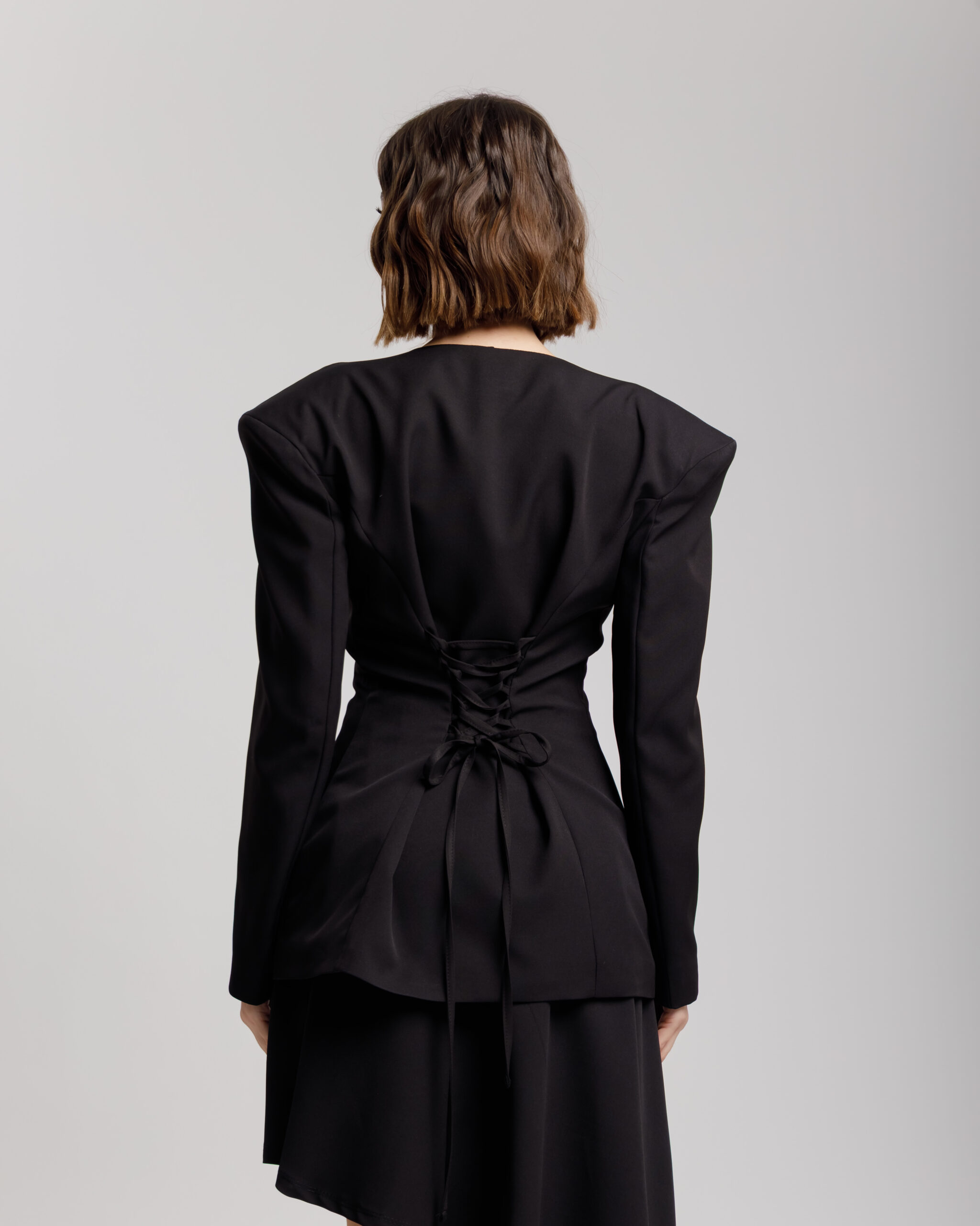 Blazer sartoriale con linea aderente che valorizza il punto vita. Presenta spalle strutturate e leggermente , scollatura profonda a V, maniche sono lunghe e affusolate, con finitura pulita e senza dettagli visibili. l capo è completato da un foulard coordinato incluso, realizzato nello stesso tessuto, retro con allacciatura regolabile tipo corsetto, che permette di adattare il fit stringendo o allentando la vita. Chiusura forntale monopetto con bottone rivestito. Interno foderato in tinta. Elastico
