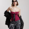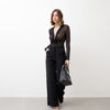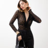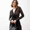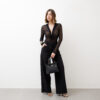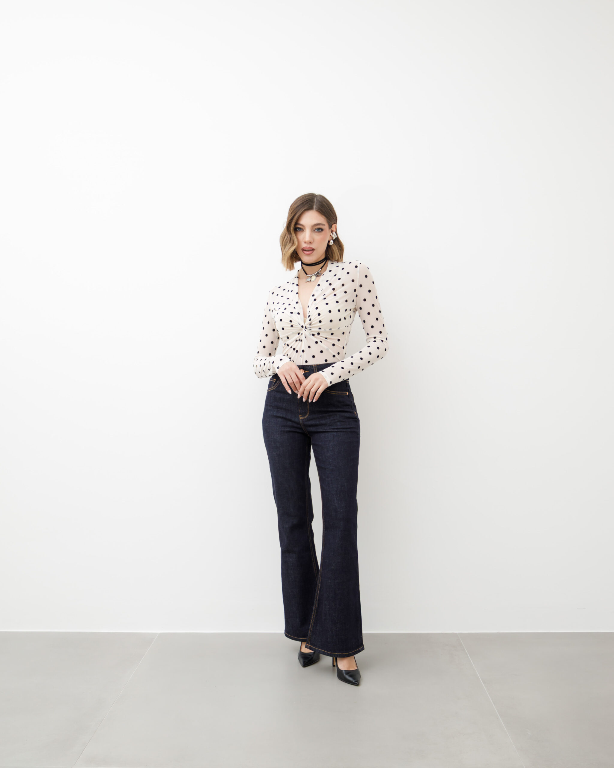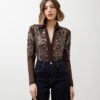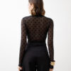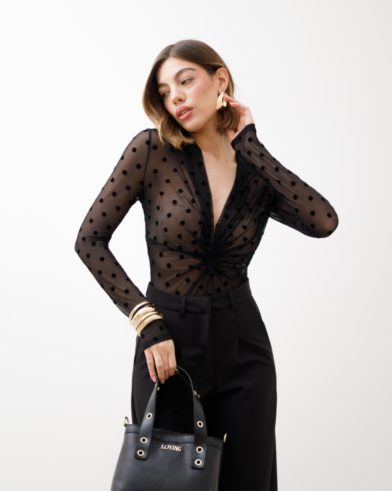 Body in tulle, manica lunga, scollo a v profondo, dettaglio nodo centrale, interamente trasparente, stampato a pois, chiusura con ganci. Elastico