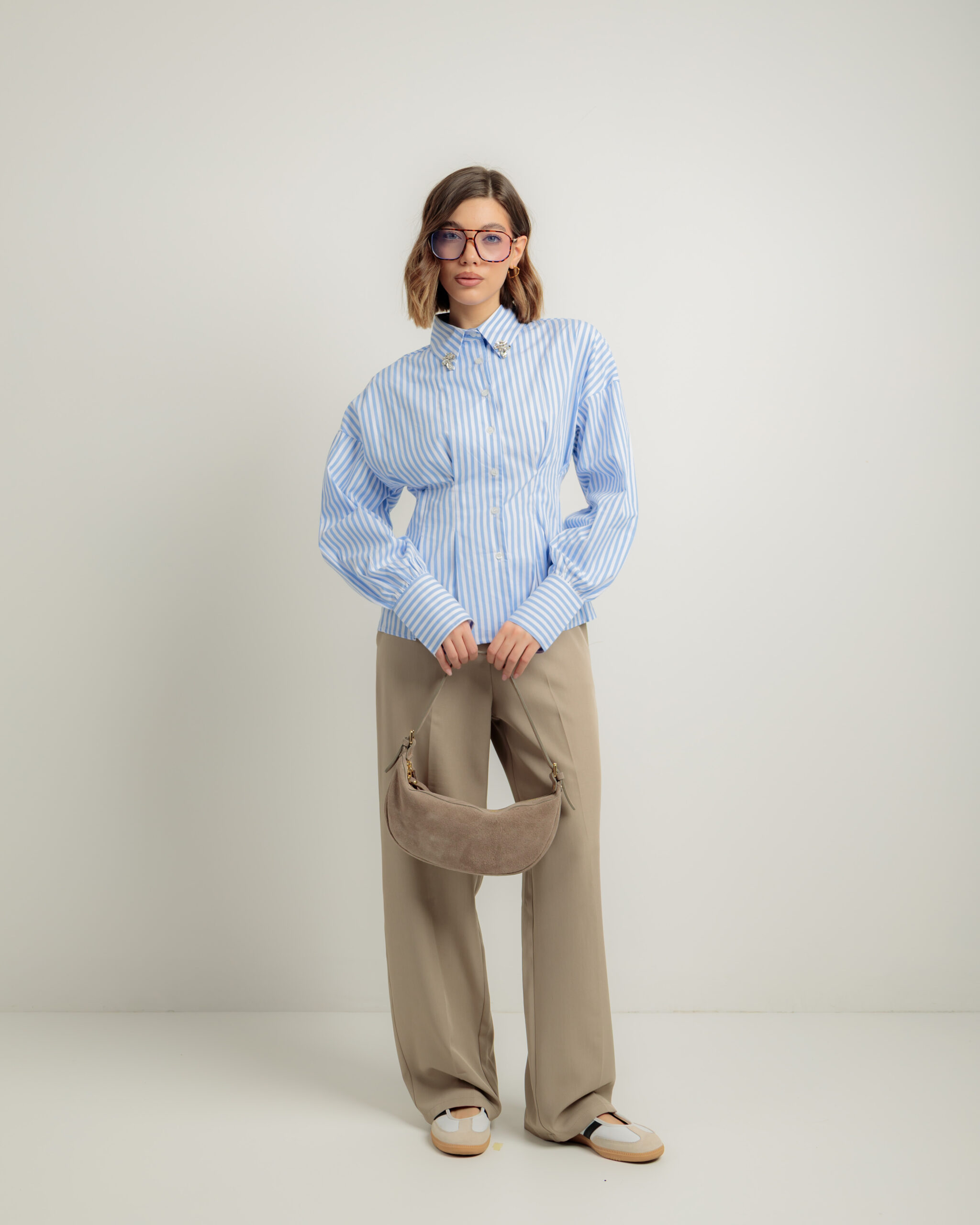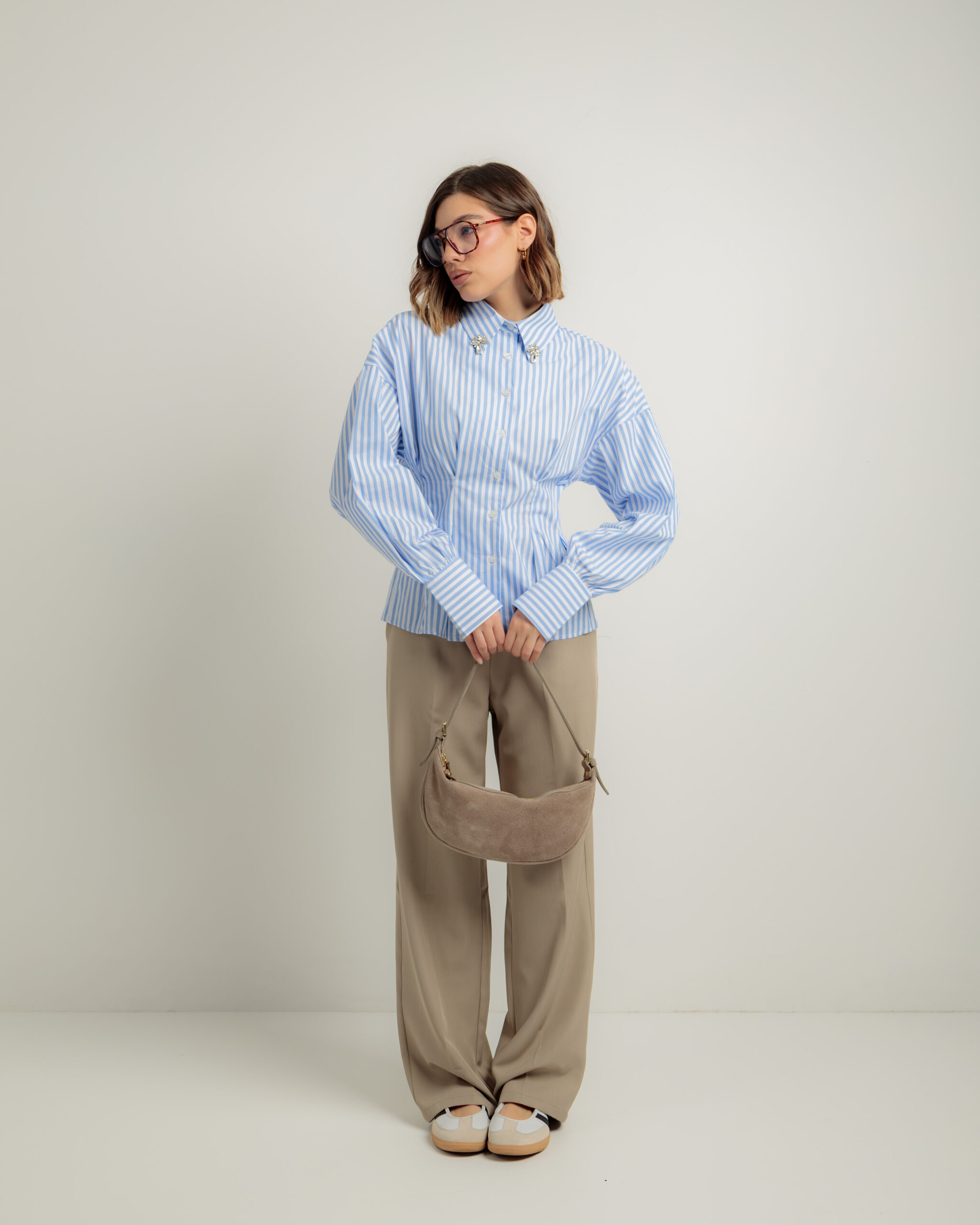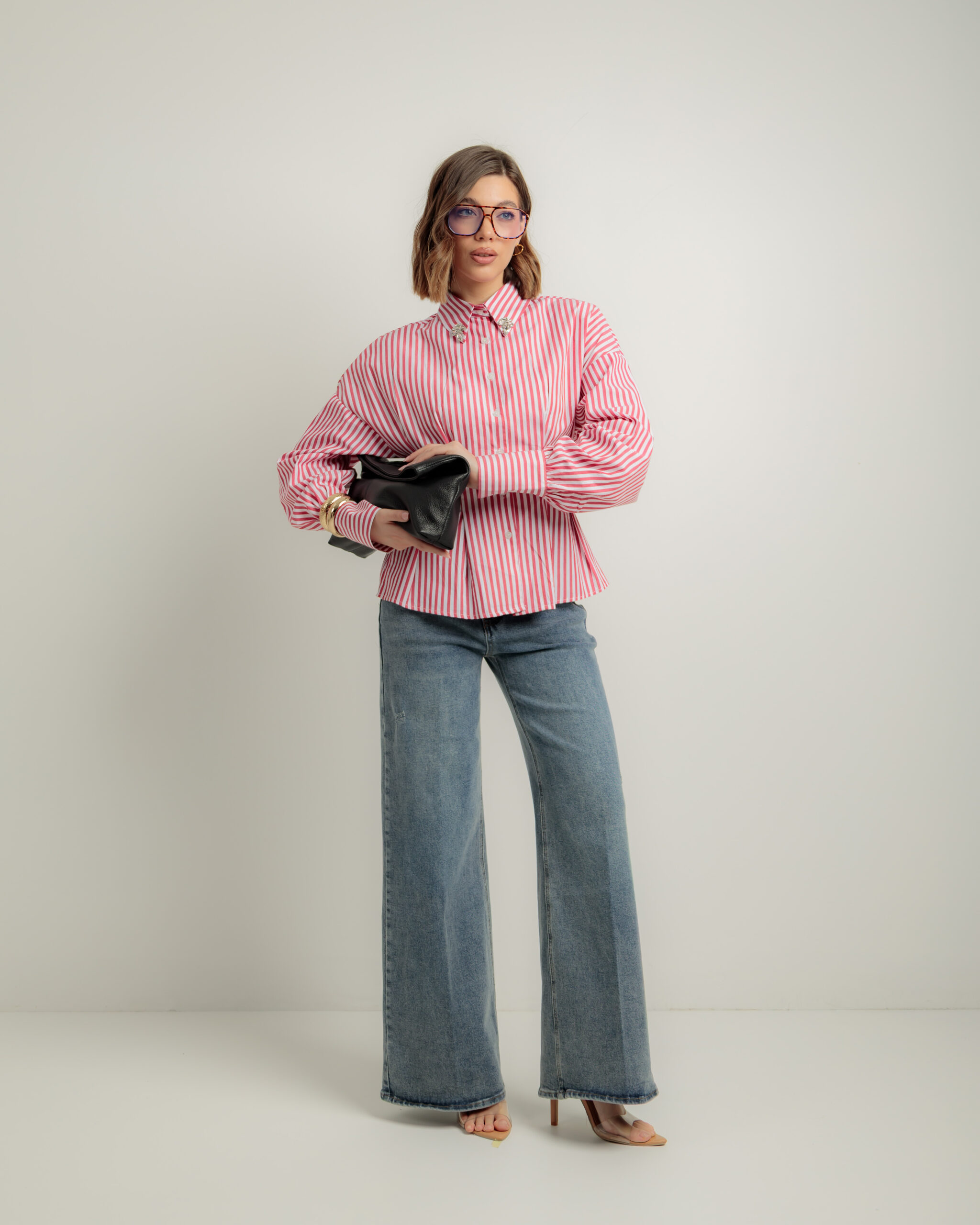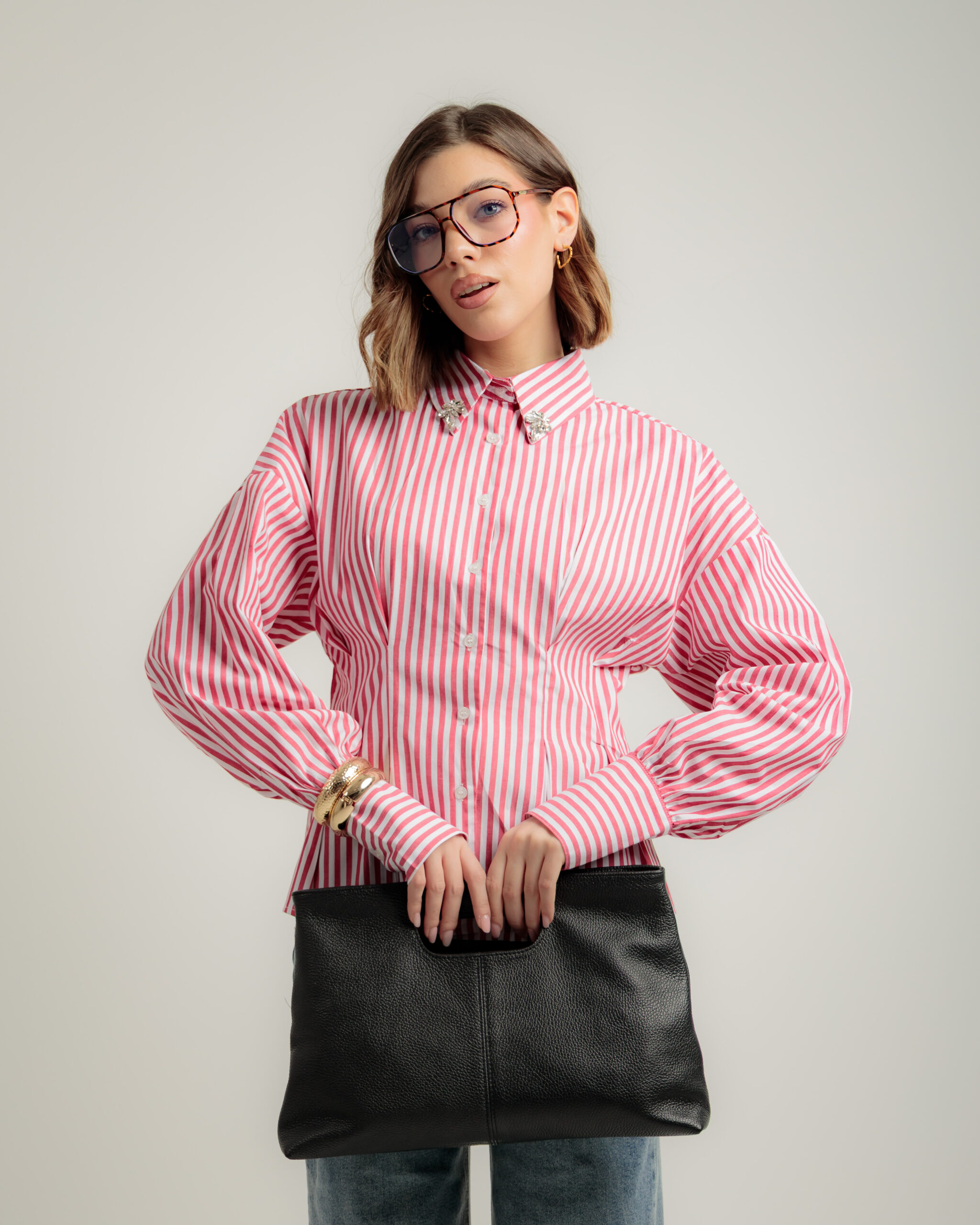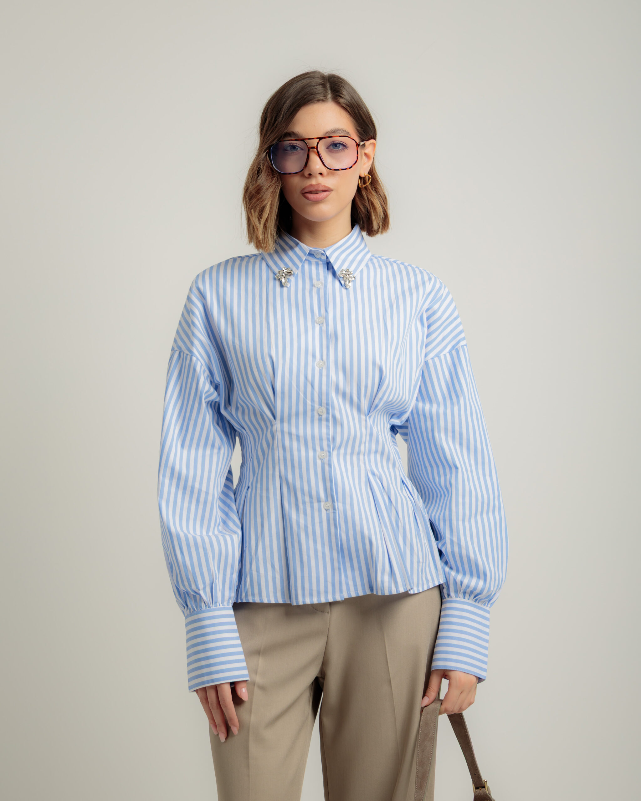 Camicia in cotone, manica lunga, regular fit, colletto rever con strass applicati, punto vita avvitato, chiusura frontale con bottoni, non elastica