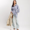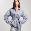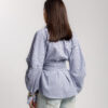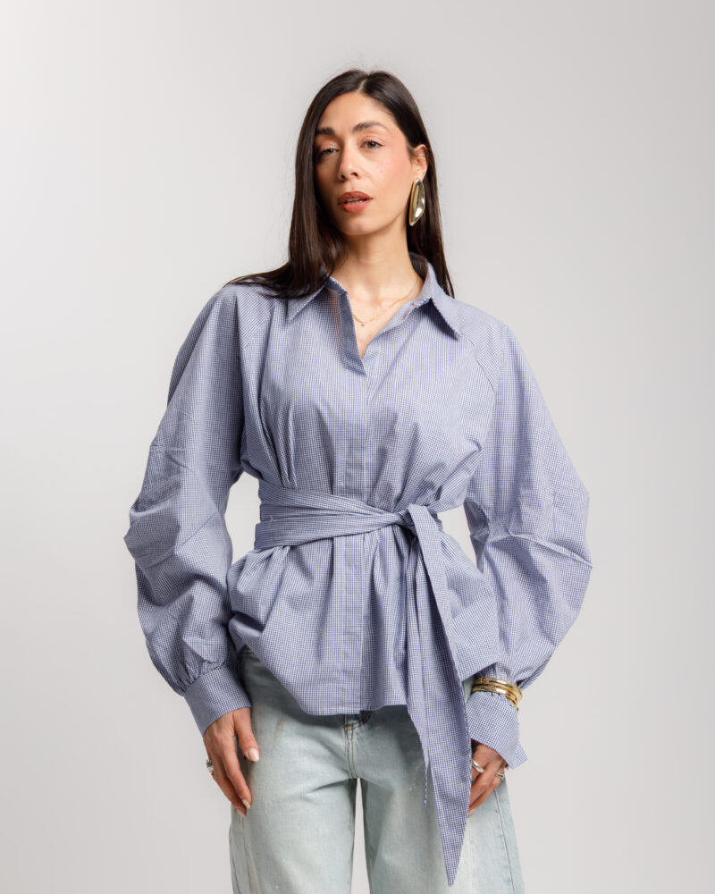 Camicia in cotone, manica lunga con colletto, trama quadretti vicky, fusciacca in vita da annodare,chiusura frontale con bottoni, lunghezza regolare, non elastica.