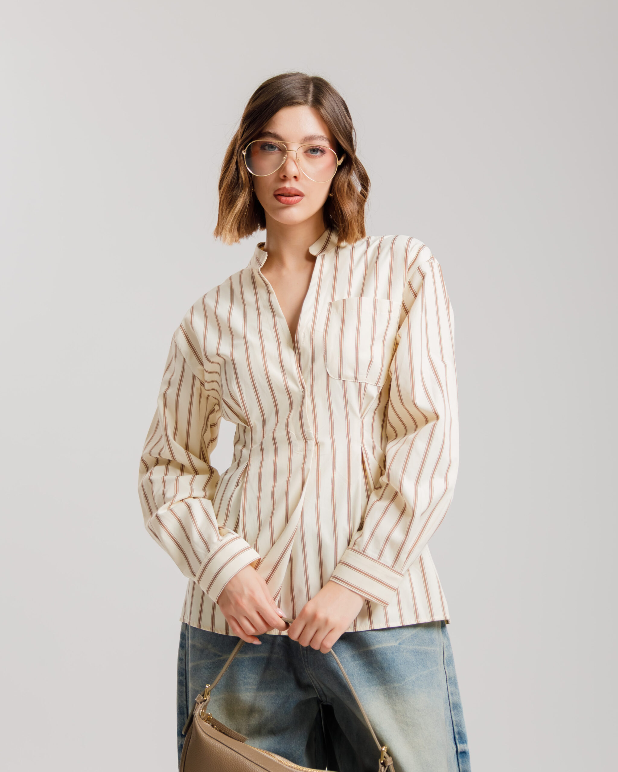 Camicia in cotone, manica lunga, colletto coreana, trama a righe, tasca frontale, punto vita segnato con riprese, lunghezza regolare. Chiusura frontale con bottoni.
