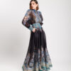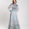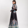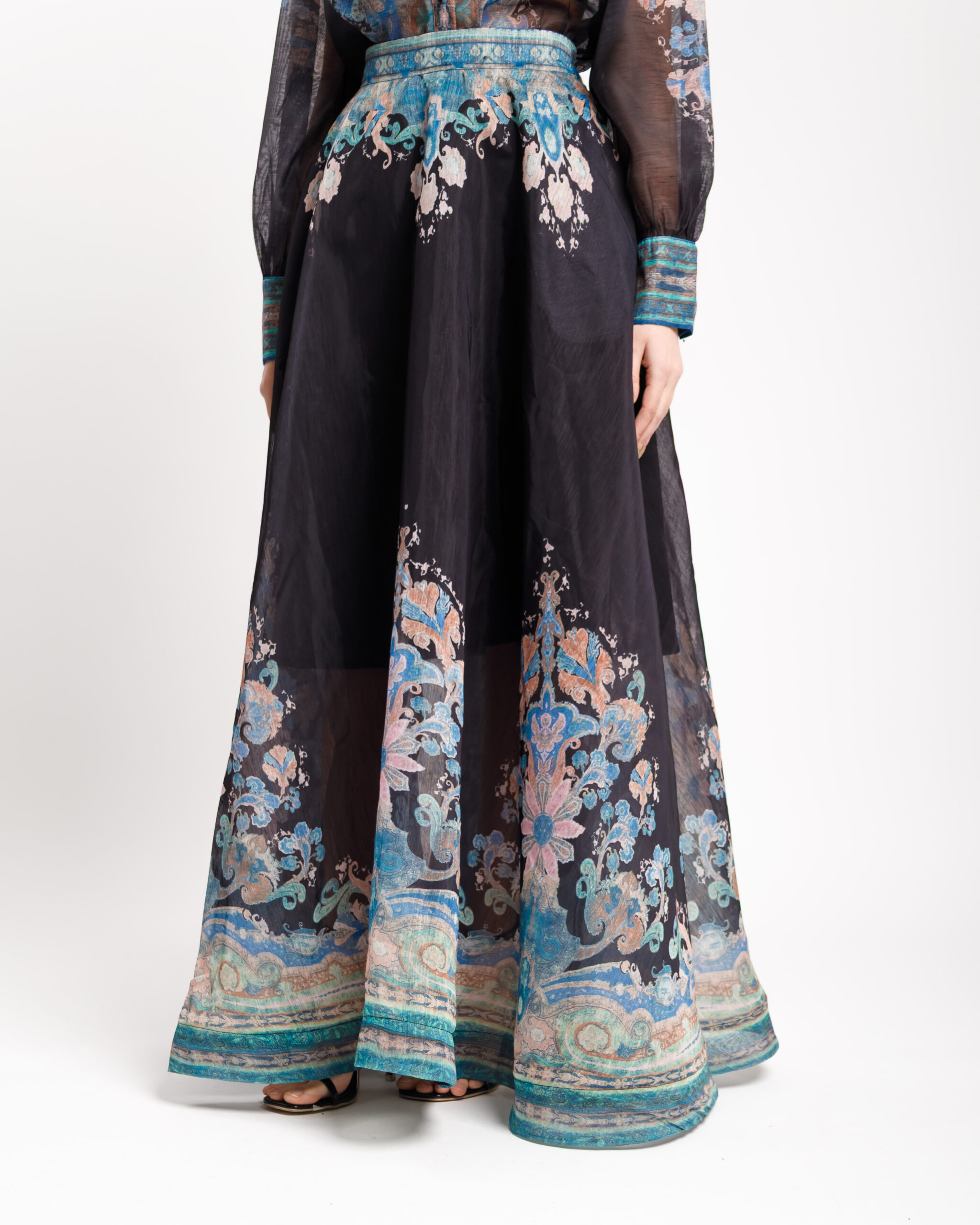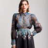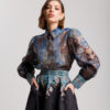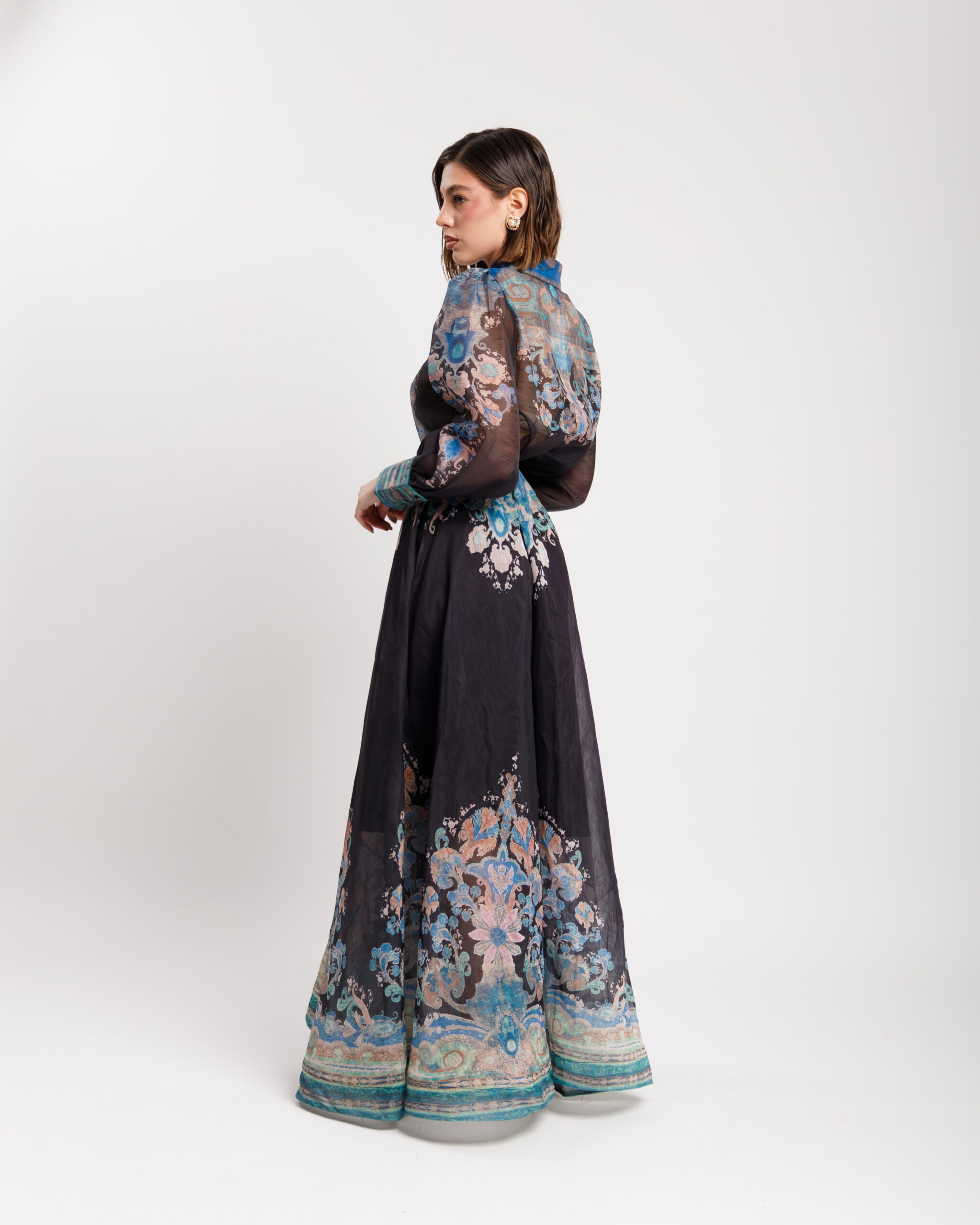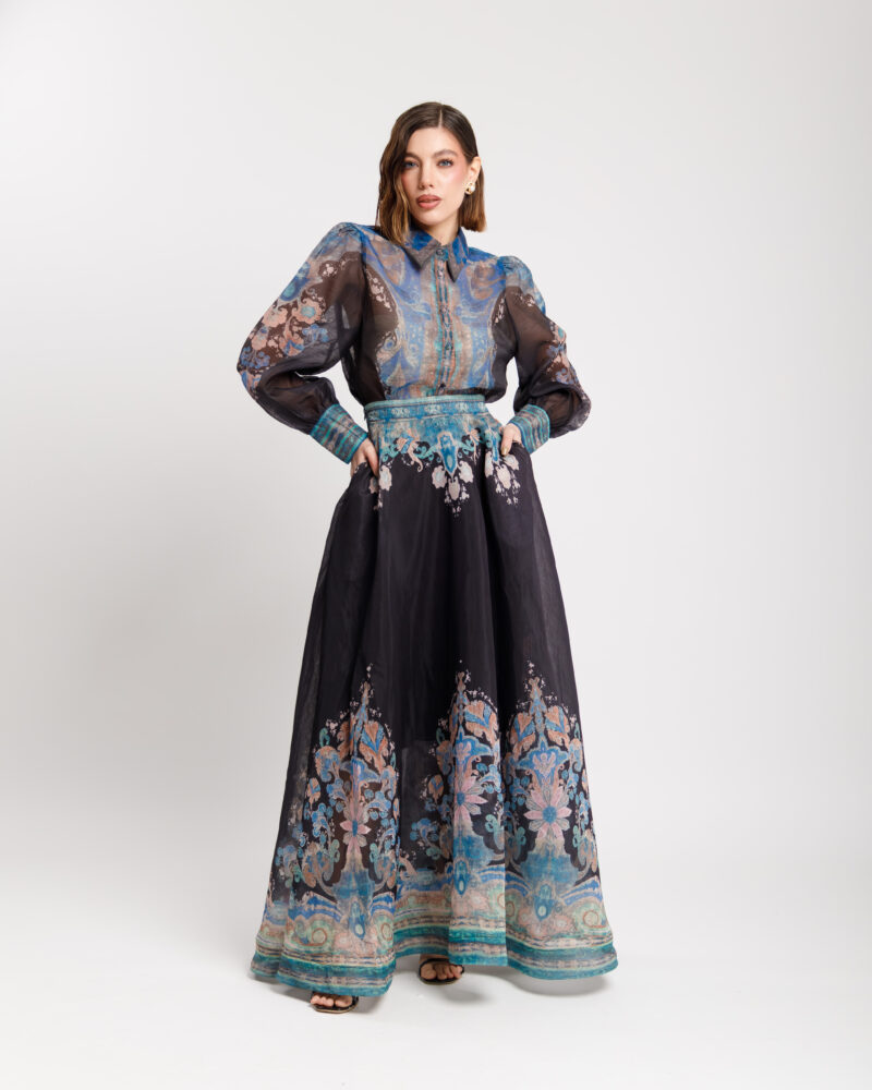 Coordinato in misto cotone e lino composto da, camicia leggera, manica lunga a palloncino, colletto revers, chiusura frontale con bottoni. Gonna vita alta con bustino strutturato, ampia e fluida, lunghezza alla caviglia, foderata, chiusura con zip invisibile. Interamente stampato. Non elastico.