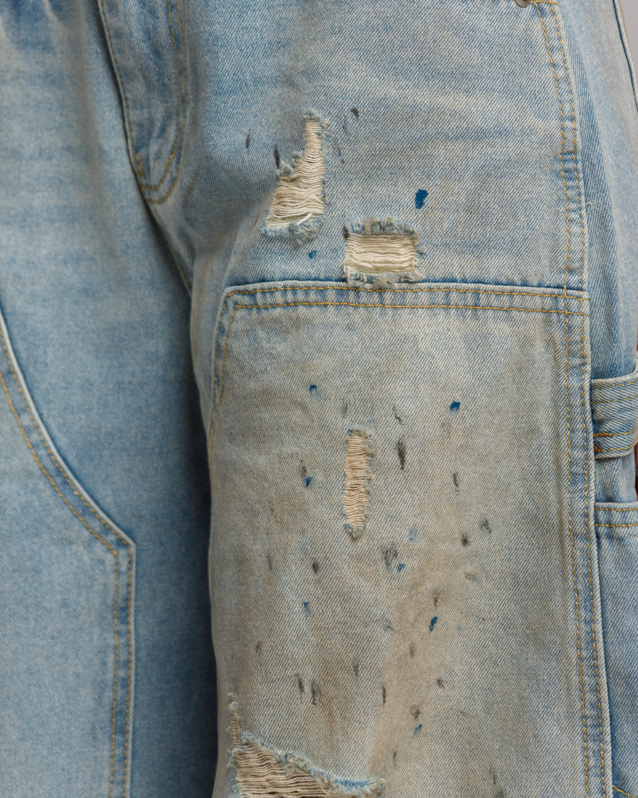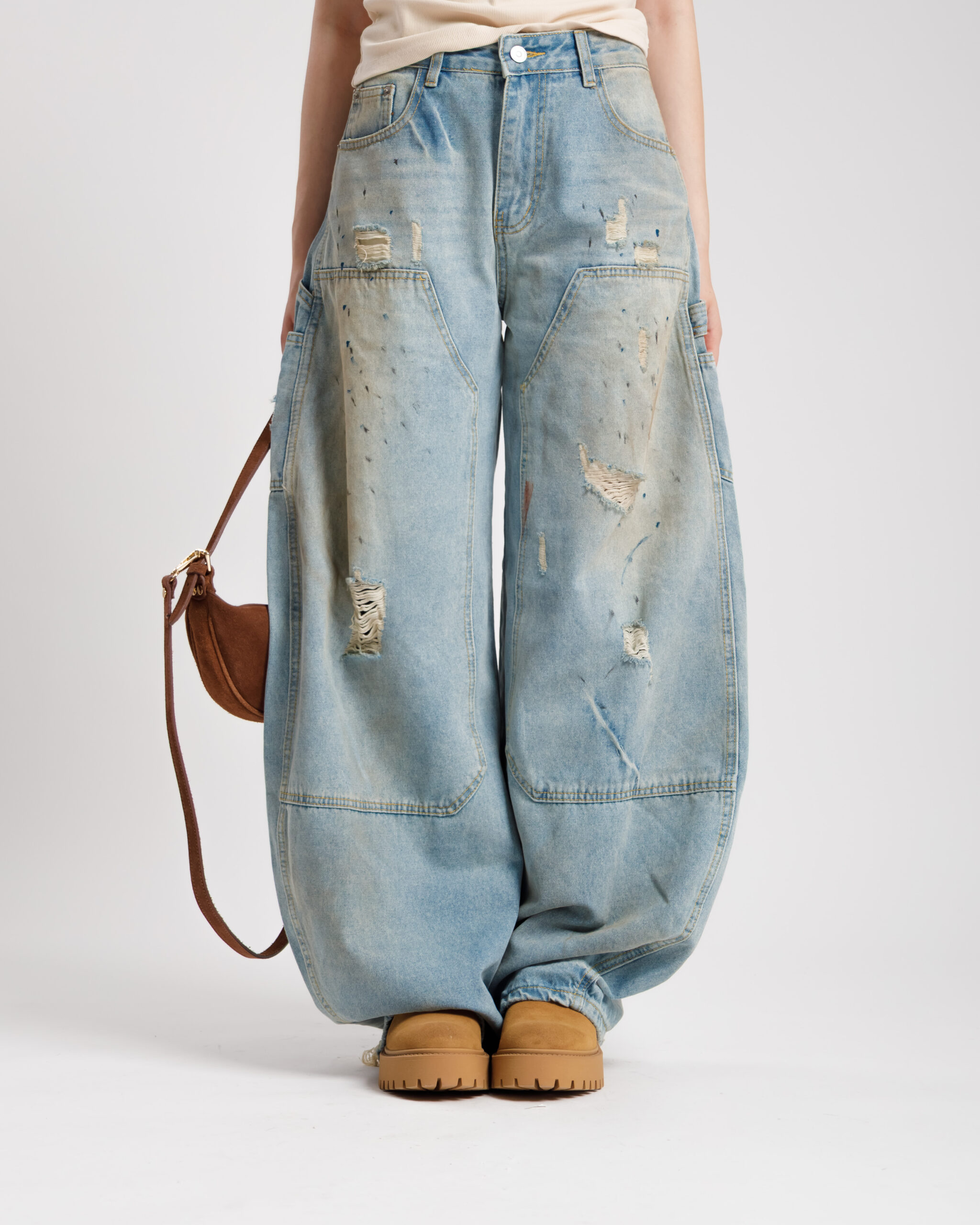Jeans vita media , cinque tasche, lavaggio blu sabbiato con rotture e effetto sporco, gamba ampia, , chiusura frontale con bottone metallico e zip. Orlo sfrangiato sul retro, Non elastico