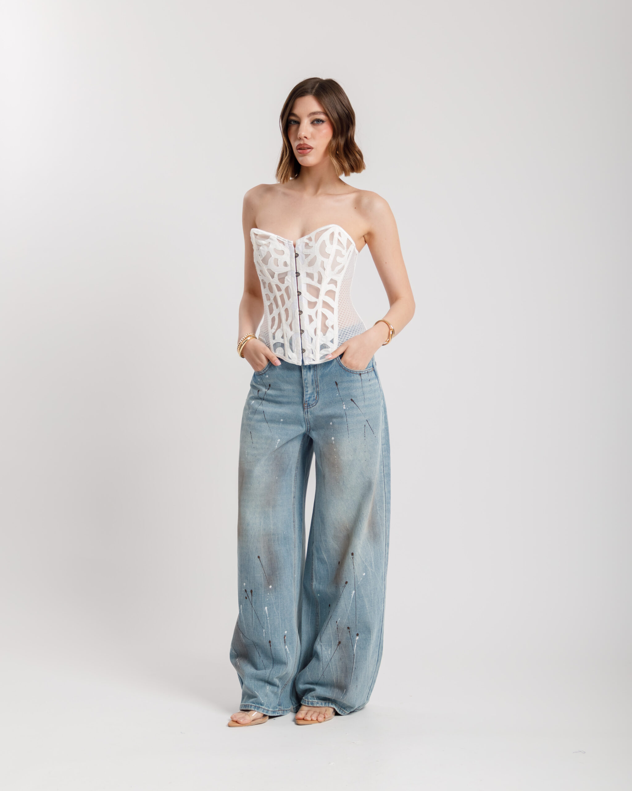 Jeans vita media, modello baggy, lavaggio blu slavato con effetto paint, chiusura frontale con bottone metallico e zip, Non elastico