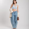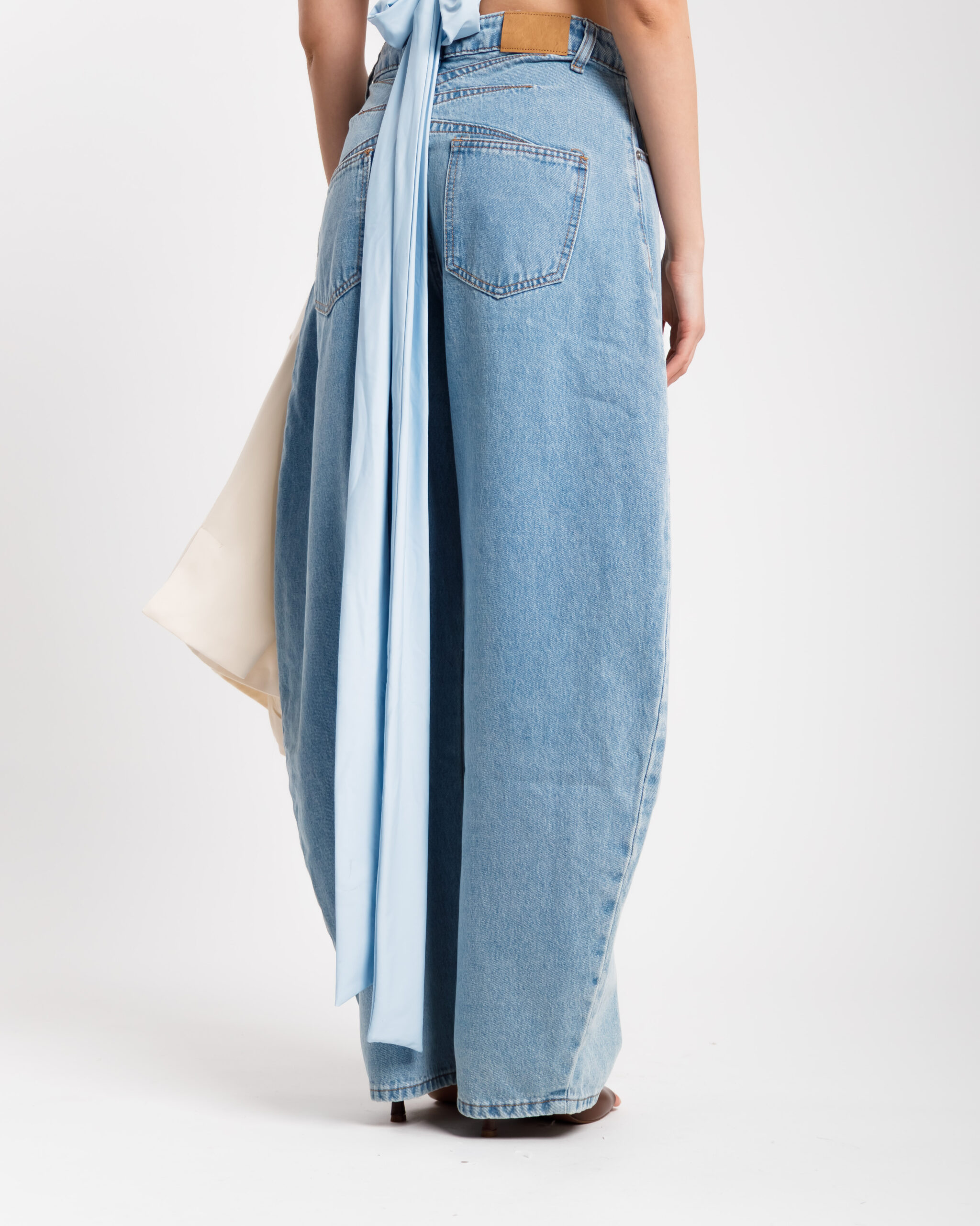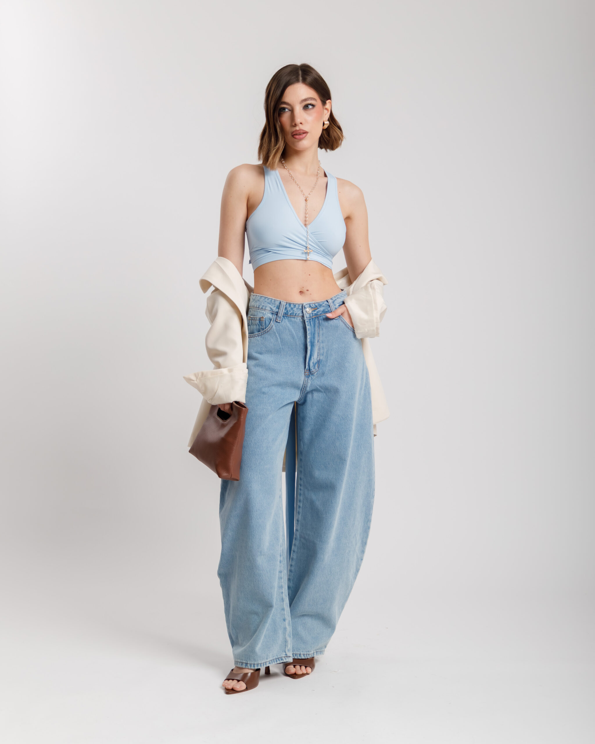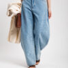Jeans ballon vita media, gamba ampia, chiusura frontale con bottone metallico e zip. Lavaggio blu chiaro. Non elastico