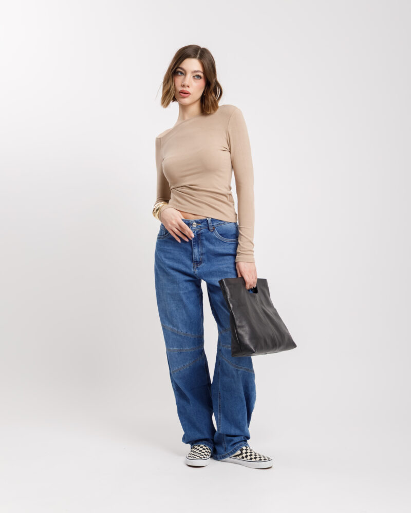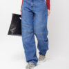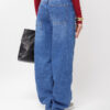 Jeans vita alta, modello ballon, dettaglio impunture frontali, gamba ampia,lavaggio blu marino, dettaglio impunture frontali a contrasto, chiusura frontale con bottone metallico e zip, poco elastico