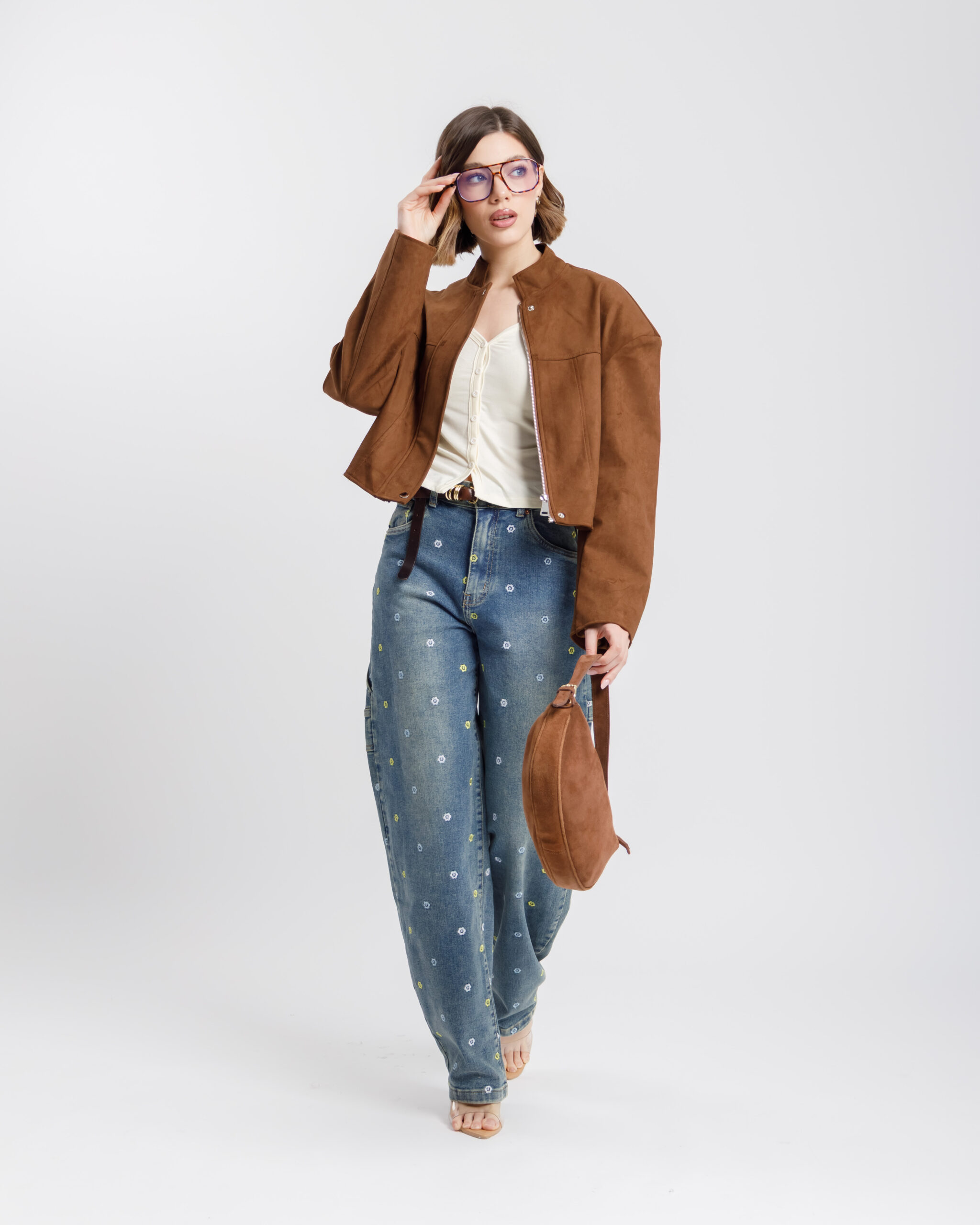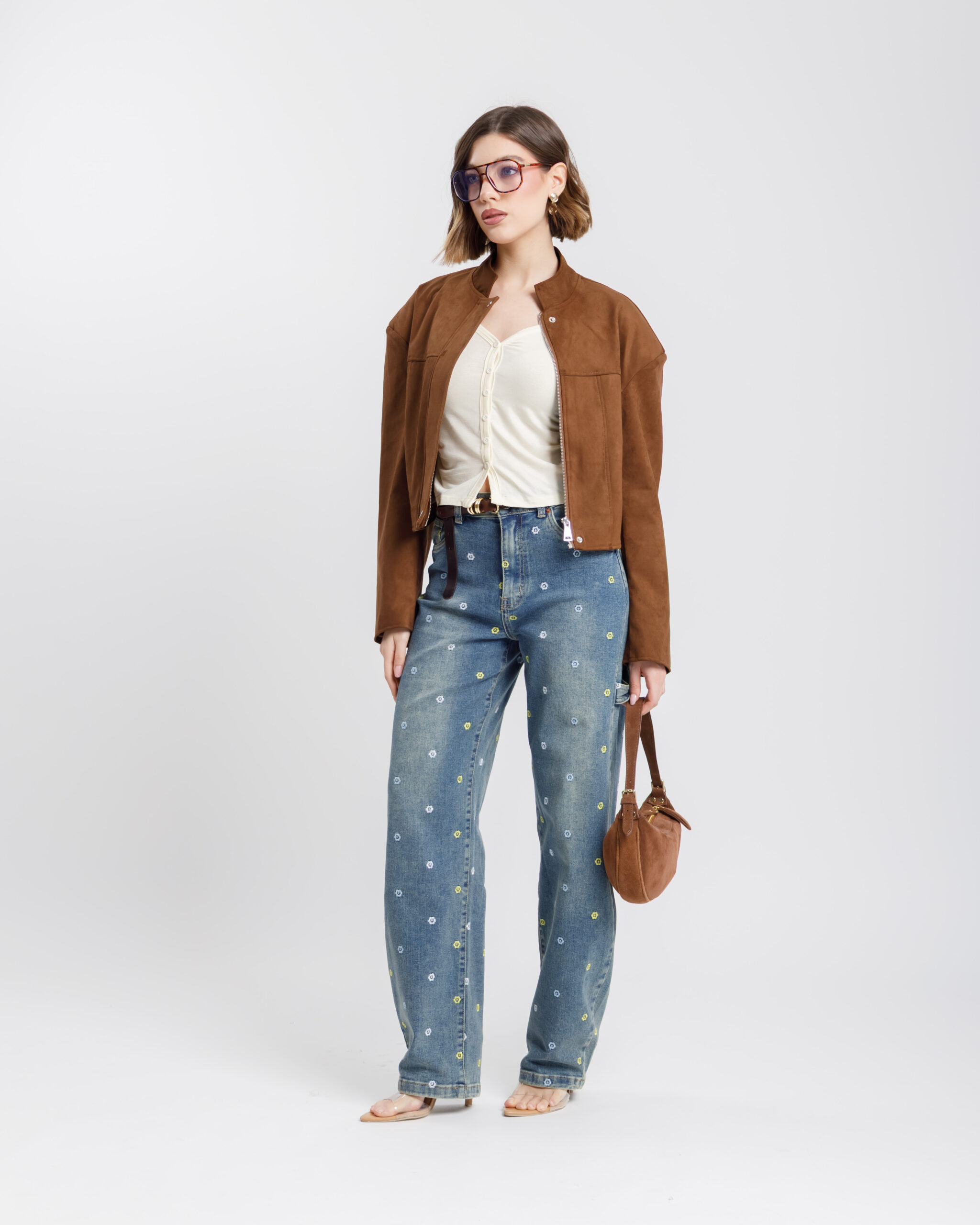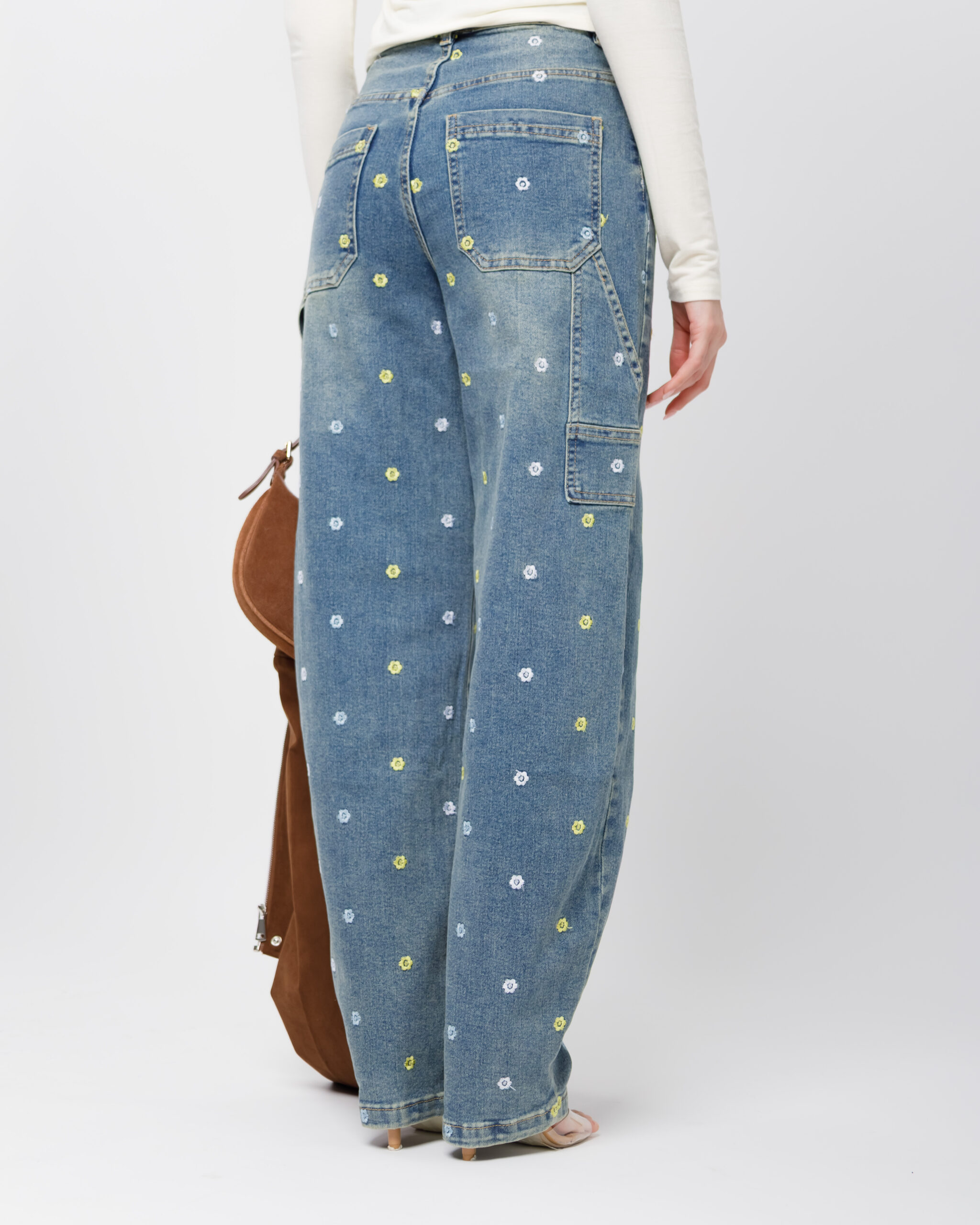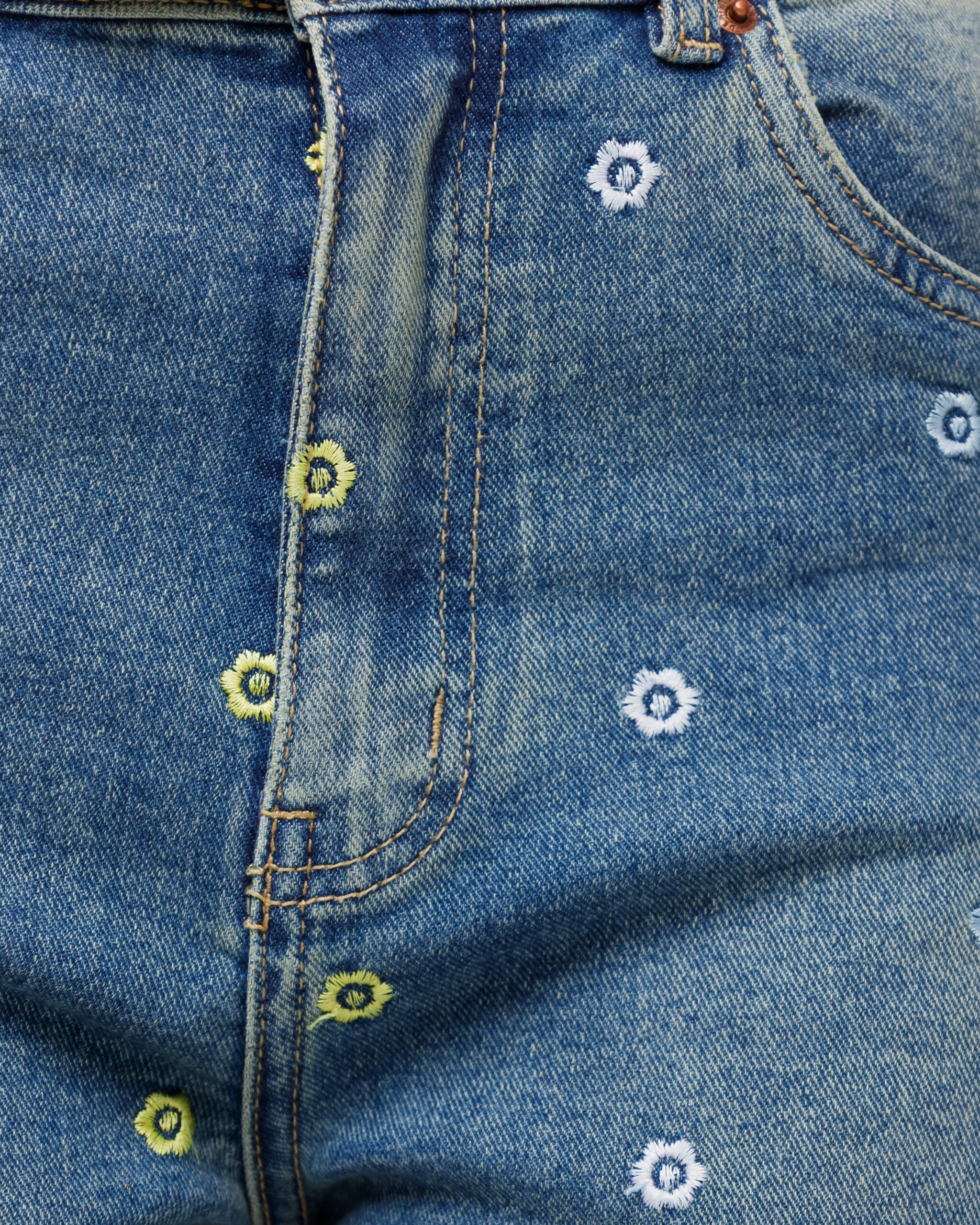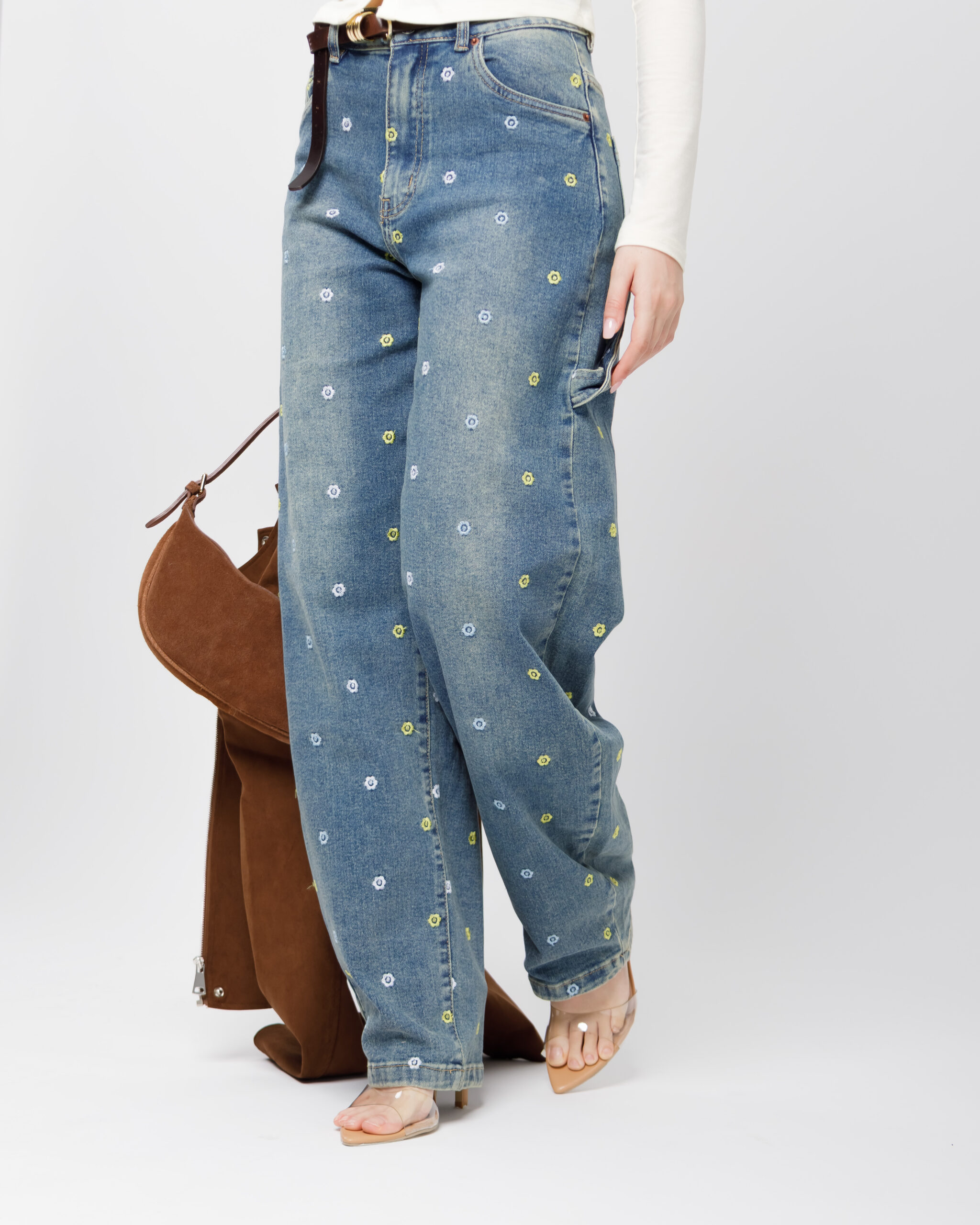 Jeans vita media modello ballon, ricamato con micro fiori multicolore, gamba ampia, lavaggio blu sabbiato, chiusura frontale con bottone metallico e zip, elastico.