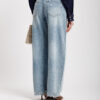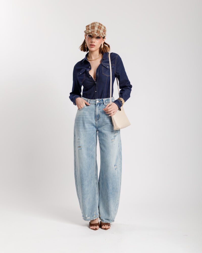 Jeans vita media, modello ballon , gamba ampia, lavaggio blu slavato con rotture, chiusura con bottone metallico e zip. Non elastico