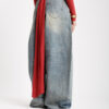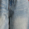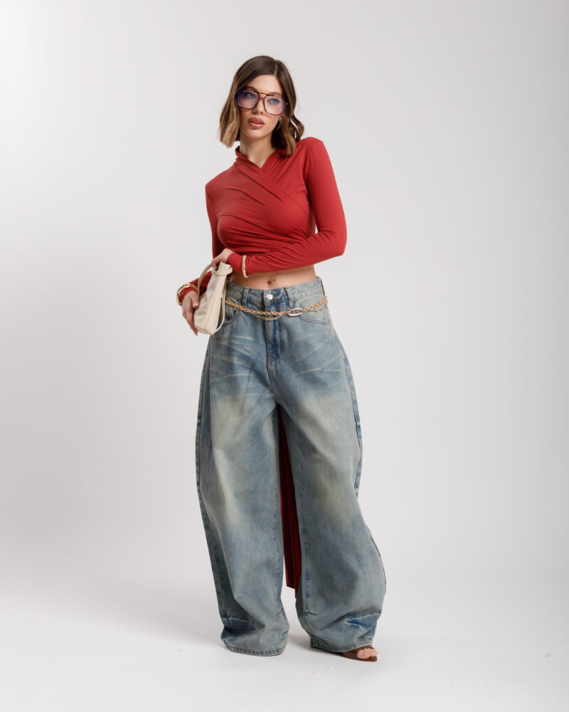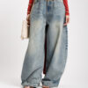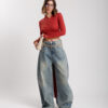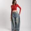 Jeans vita media, modello ballon, lavaggio blu slavato con venature, chiusura frontale con bottone metallico e zip, Non elastico