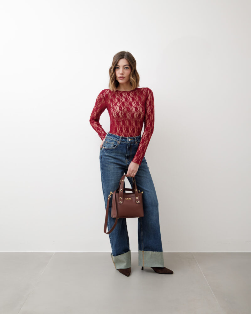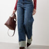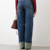 Jeans vita alta, cinque tasche, modello wide leg, lavaggio blu marino slavato, dettaglio piega sfrangiata su orlo, chiusura con bottone metallico e zip. Poco elastico.