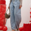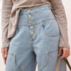 Jeans vita alta, bustino strutturato, modello baggy gamba ampia, tasche grandi applicate, chiusura con bottoni frontali, non elastico