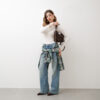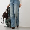 Jeans vita alta, cinque tasche, modello flare, orlo svasato, lavaggio blu slavato, chiusura frontale con bottone metallico e zip, poco elastico.