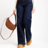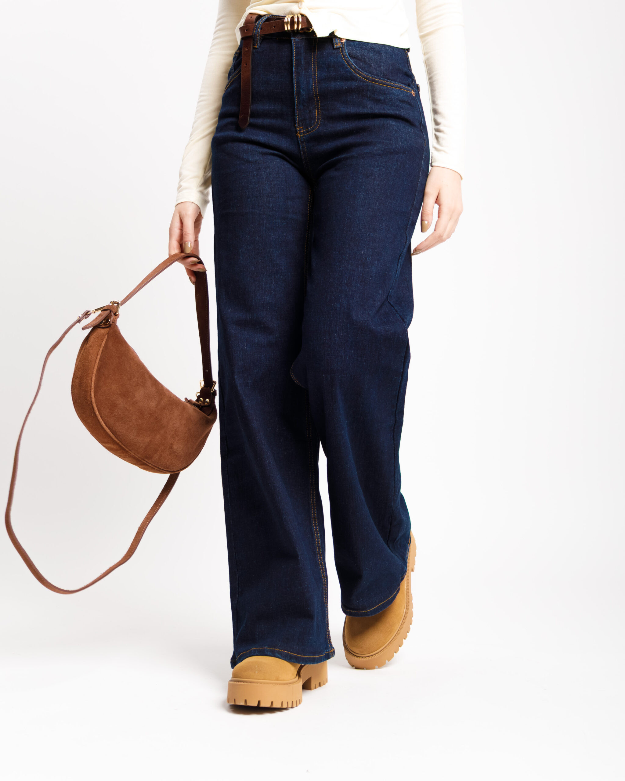 Jeans vita media, cinque tasche, gamba dritta, orlo cucito , lavaggio blu marino, chiusura frontale con bottone metallico e zip, elastico