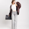 Jeans vita bassa, cinque tasche, modello flare, dettaglio tasche con patta sul retro con bottone metallico, lavaggio grigio slavato, impunture a contrasto, chiusura con bottone metallico e zip. Elastico