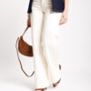 Jeans vita bassa, cinque tasche, modello flare, dettaglio tasche con patta sul retro con bottone metallico, lavaggio panna , impunture a contrasto, chiusura con bottone metallico e zip. Elastico
