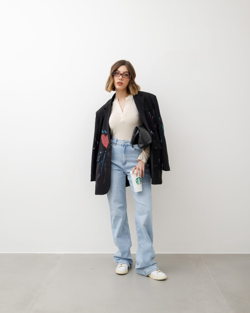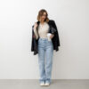 Jeans vita alta, cinque tasche, modello wide leg, lavaggio blu slavato. Chiusura frontale con bottone metallico e zip. Elastico
