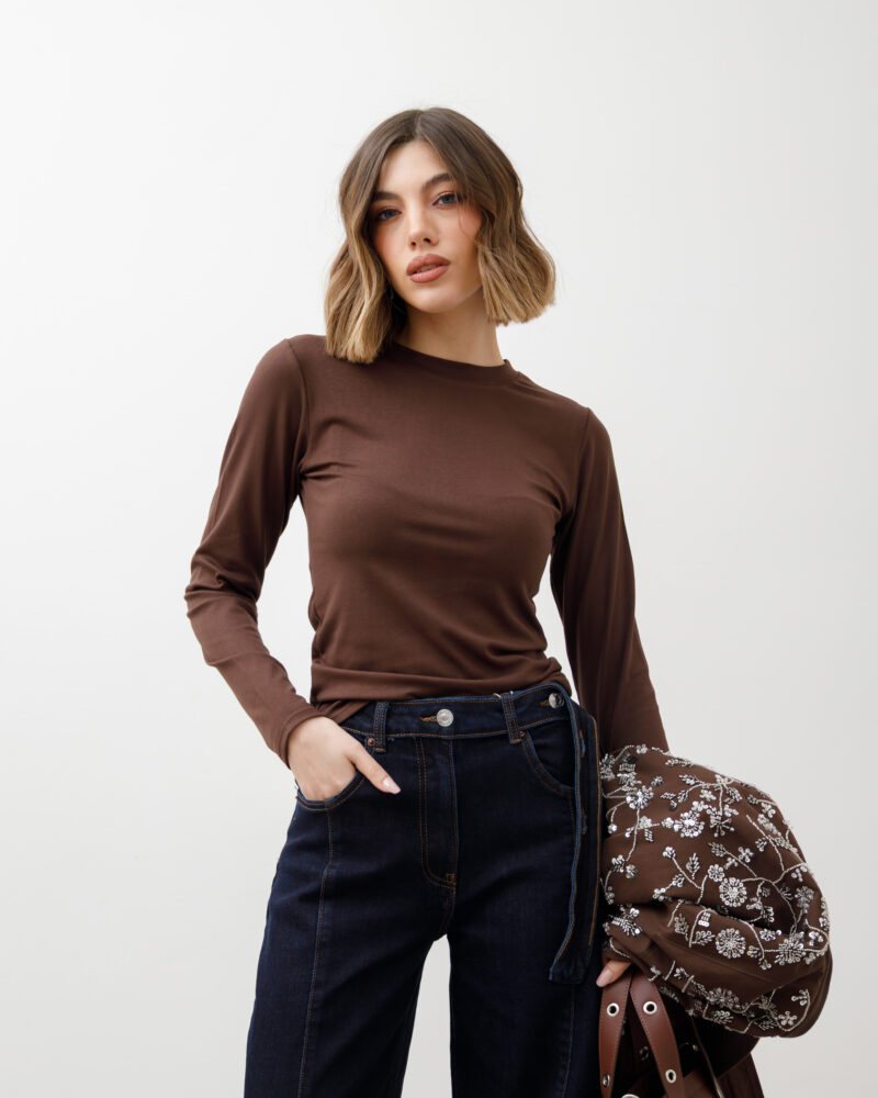 Maglia in misto rayon, manica lunga, girocollo, aderente ed elastica, lunghezza regolare.