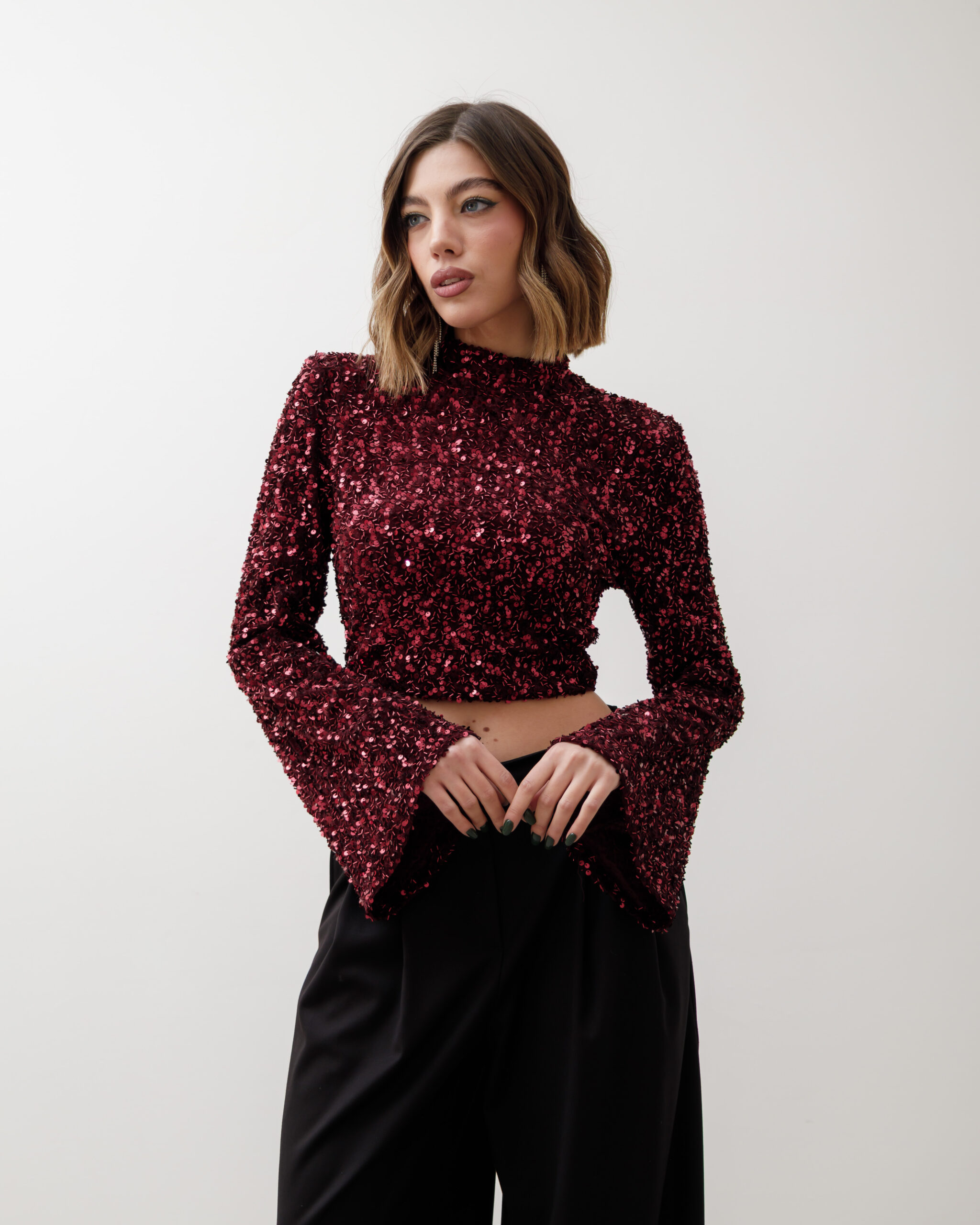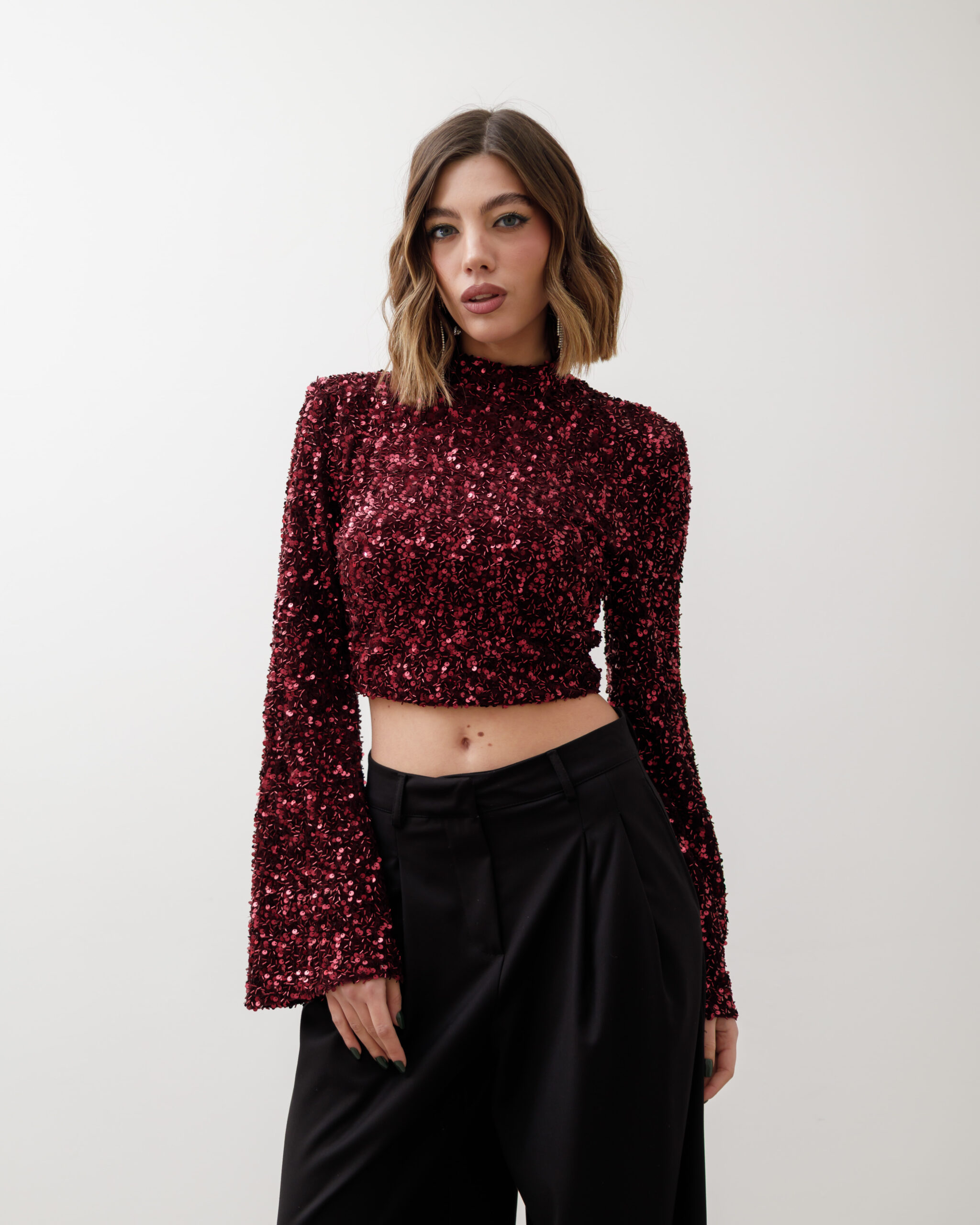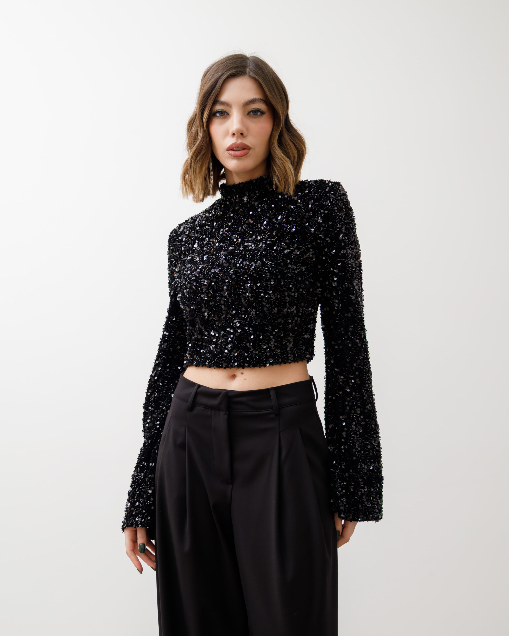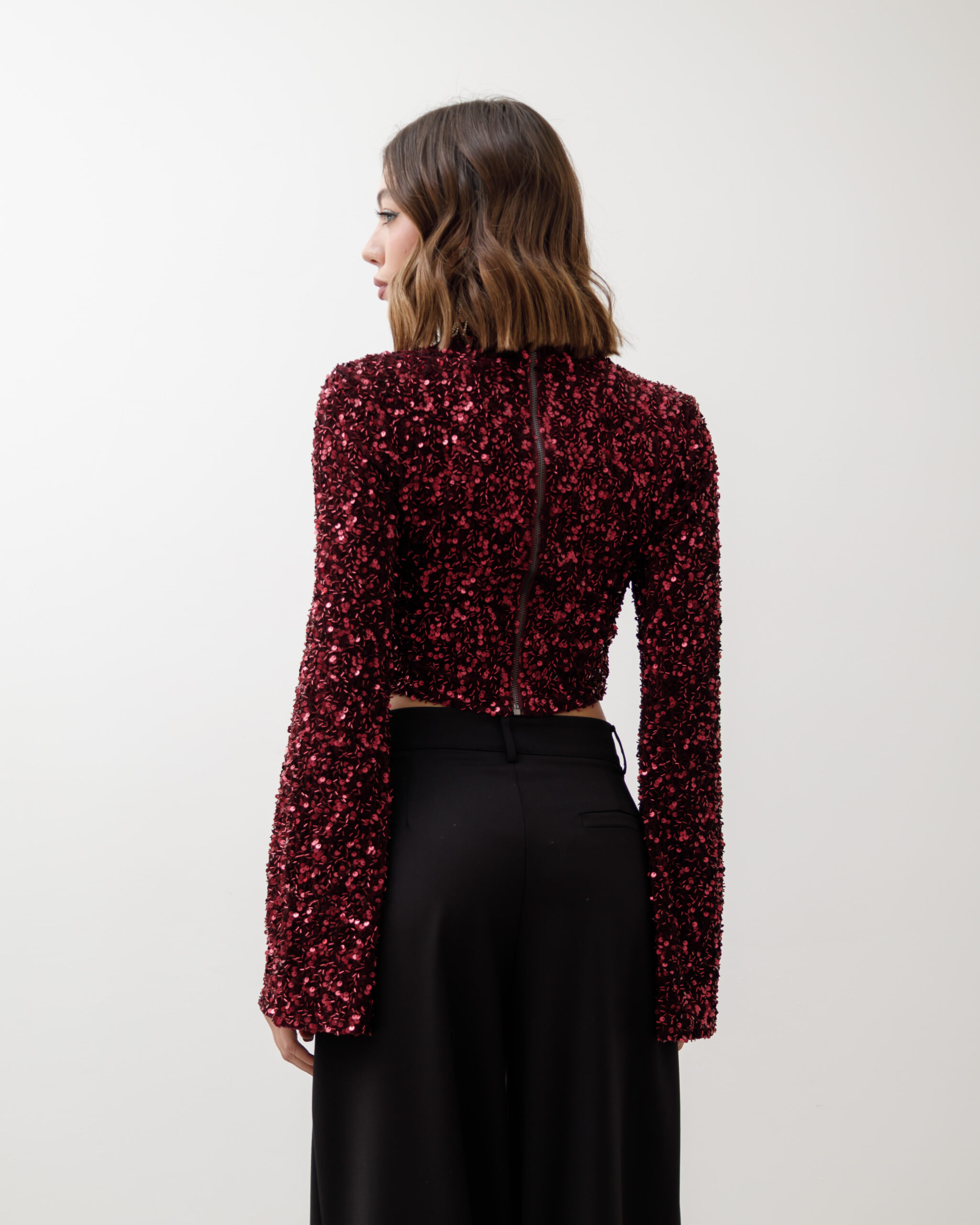 Maglia crop, manica lunga a campana, colletto alto e paillettes, spalla strutturata. chiusura sul retro con zip, non elastica