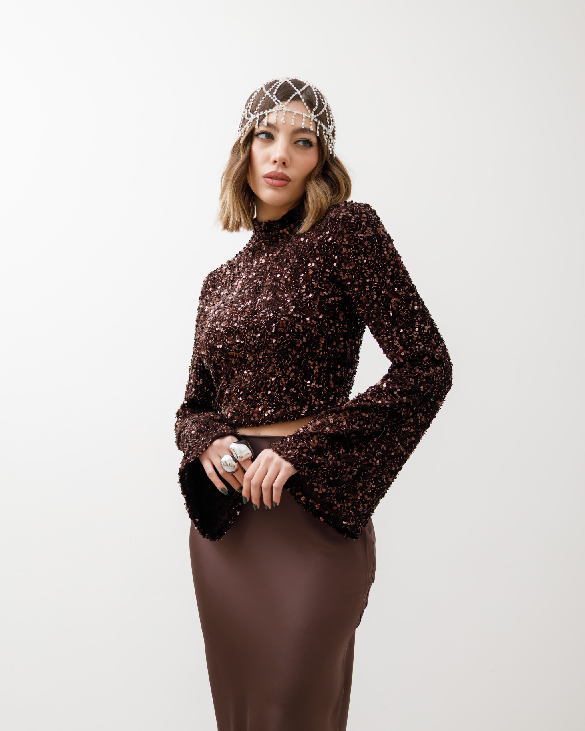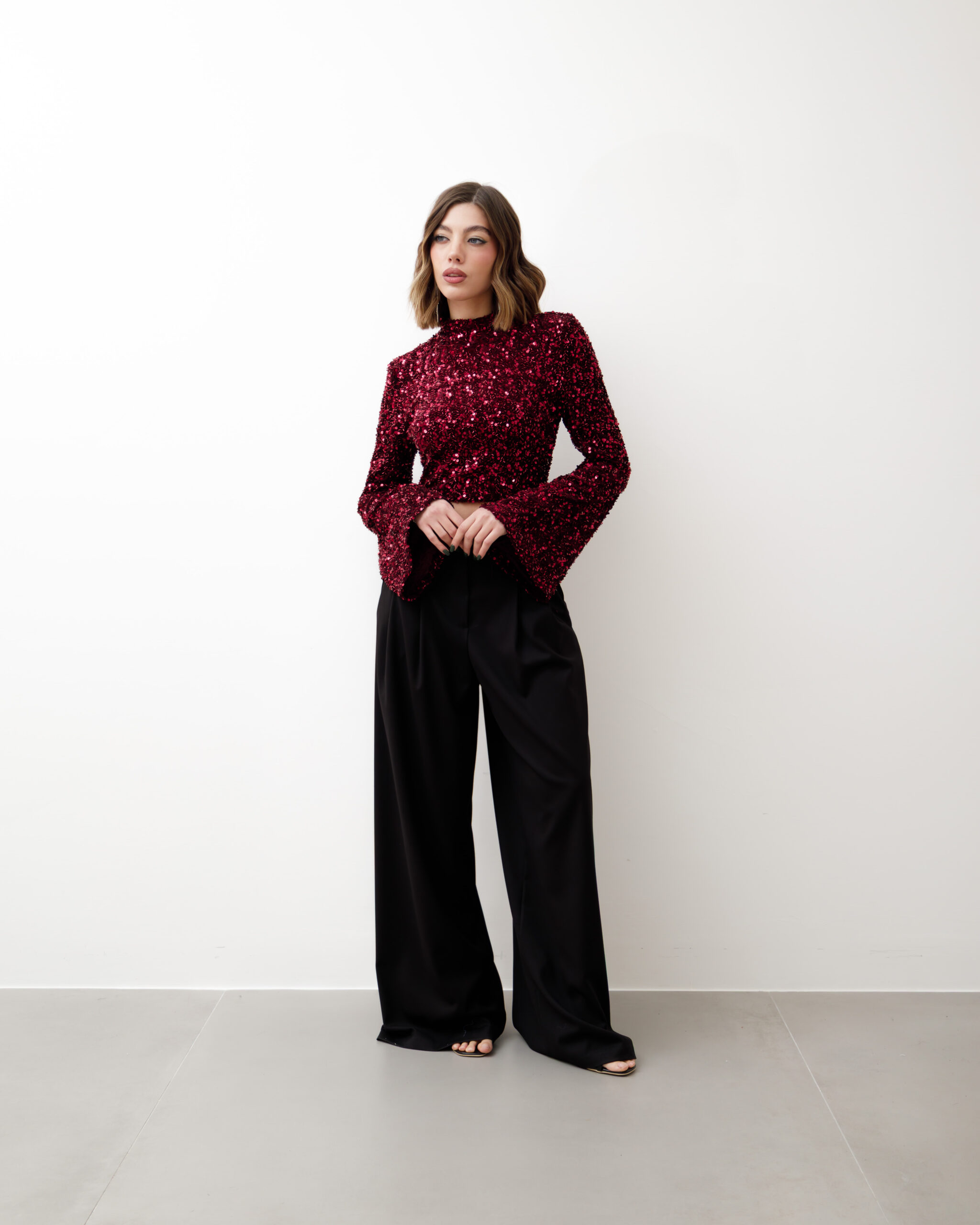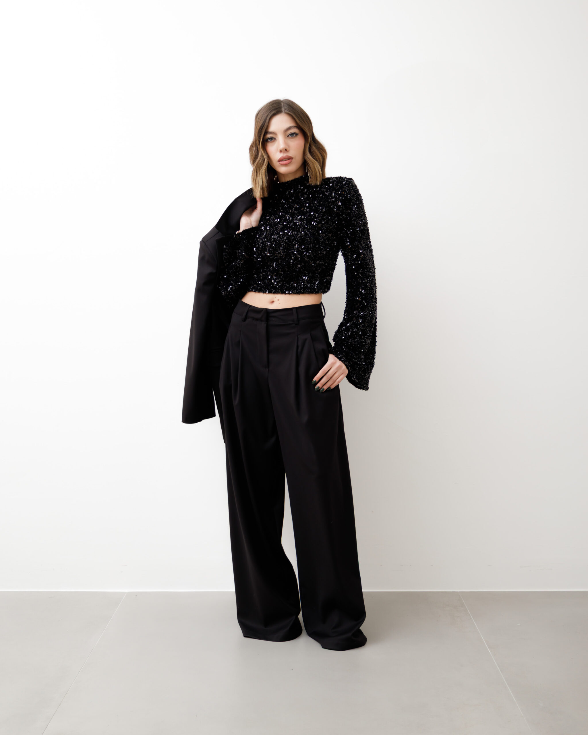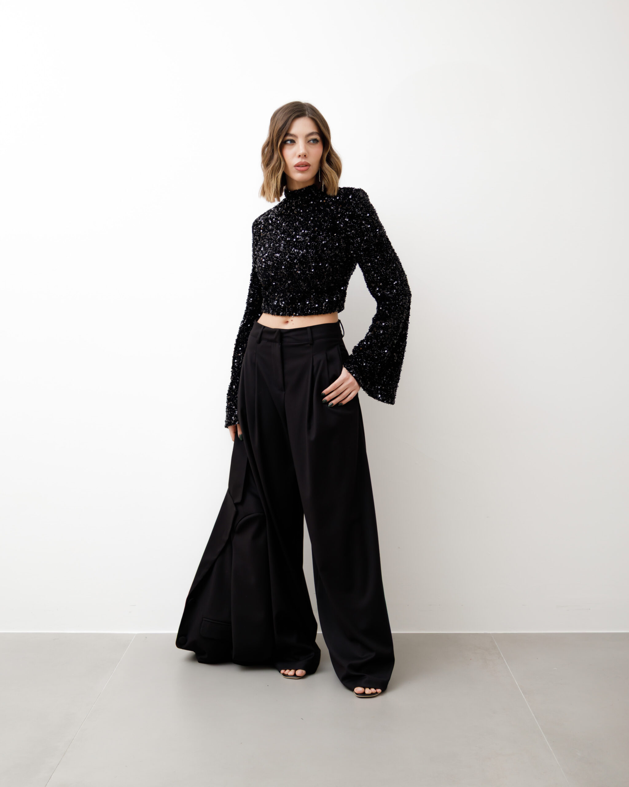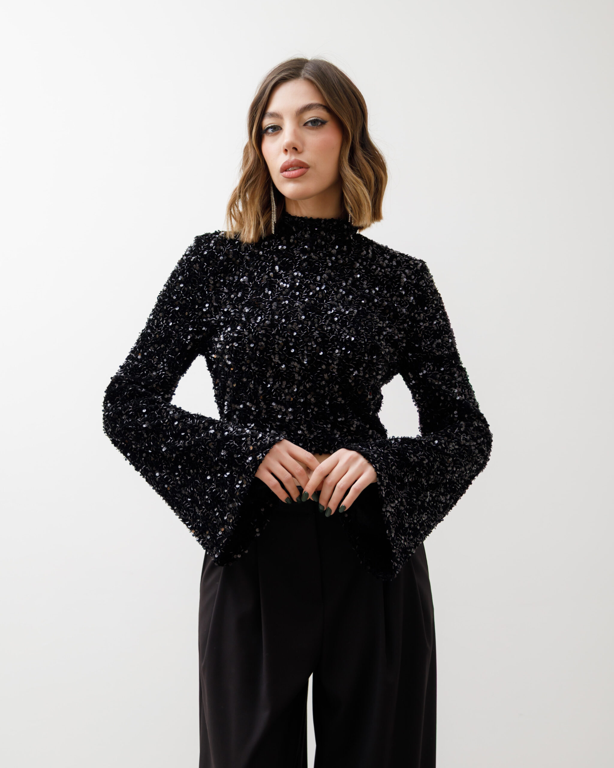 Maglia crop, manica lunga a campana, colletto alto e paillettes, spalla strutturata. chiusura sul retro con zip, non elastica