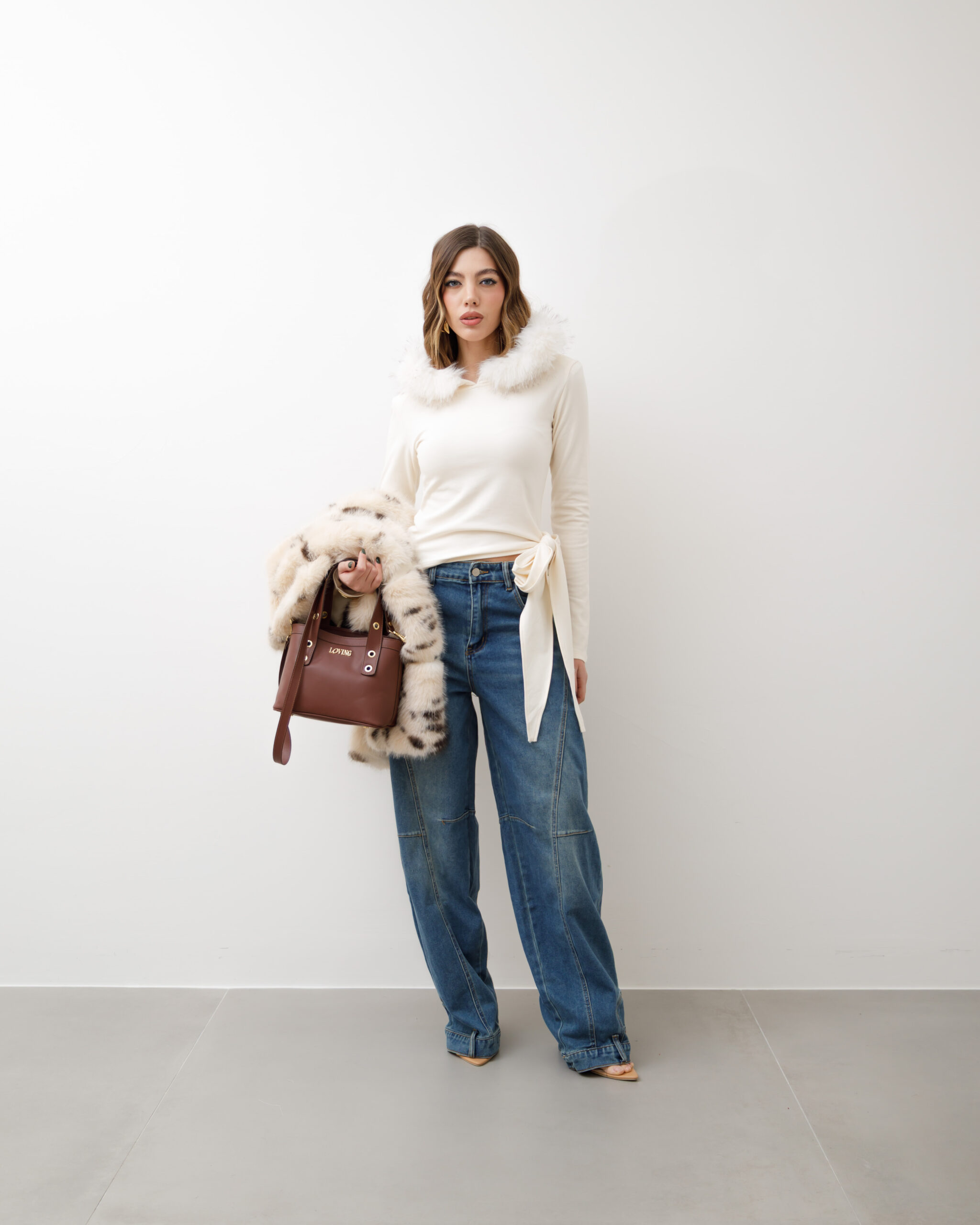 Maglia in cotone felpata internamente, manica lunga, girocollo con cappuccio con eco-fur. Lunghezza regolare, dettaglio nastri da annodare su orlo, elastica