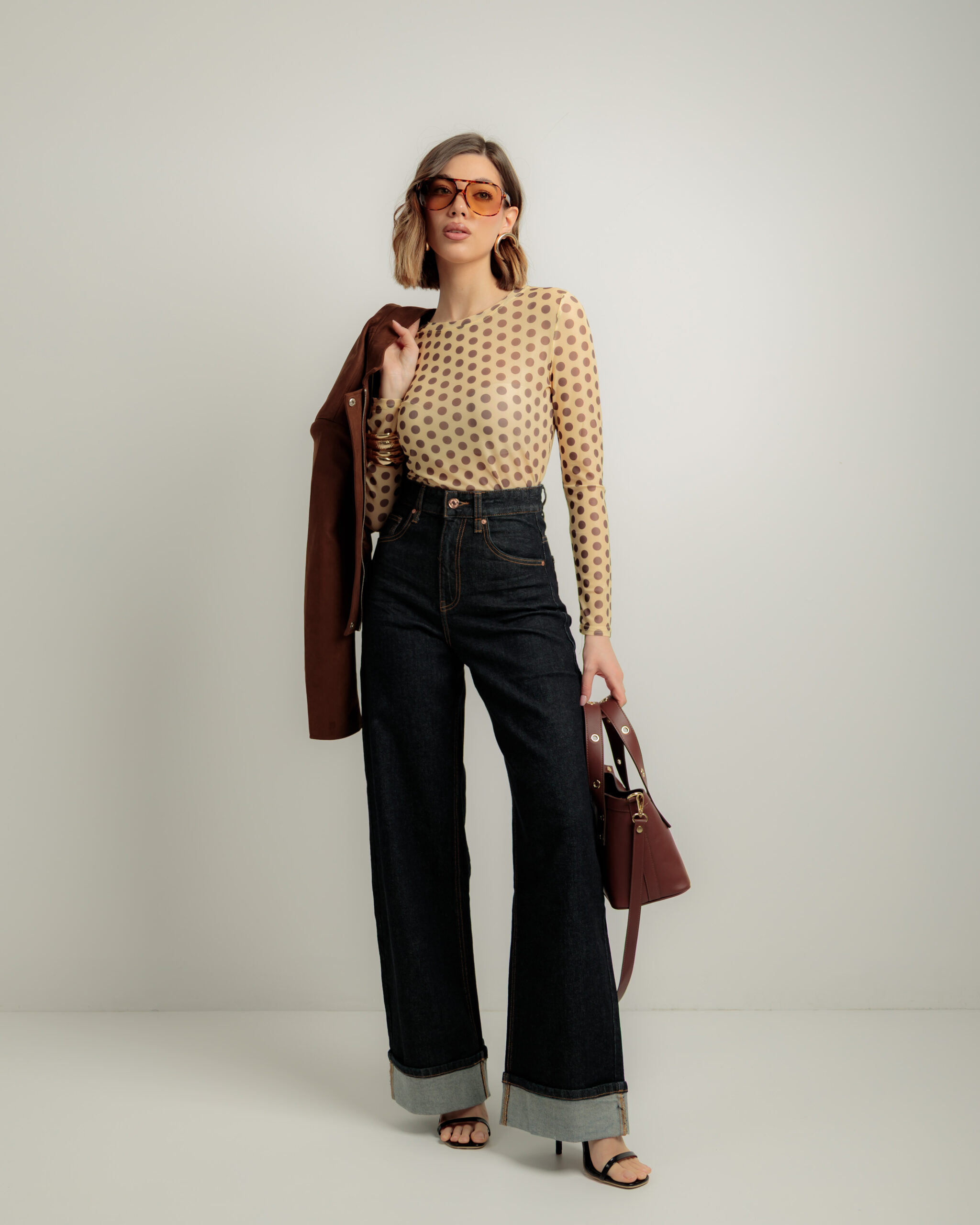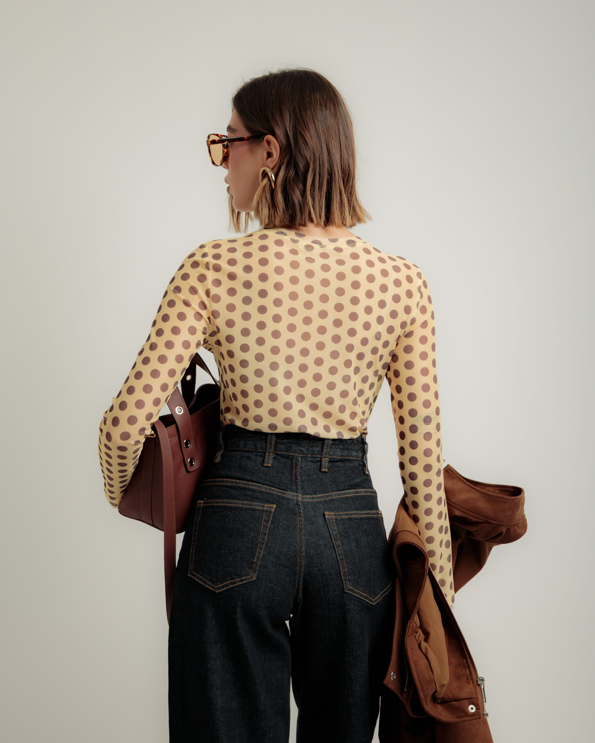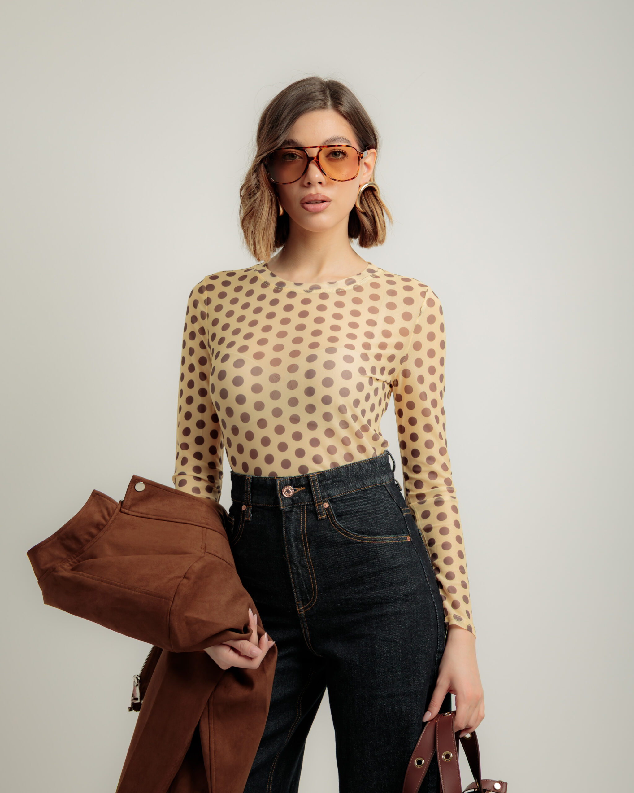 Maglia in tulle, manica lunga, girocollo, stampa pois, trasparente, lunghezza regolare, elastica