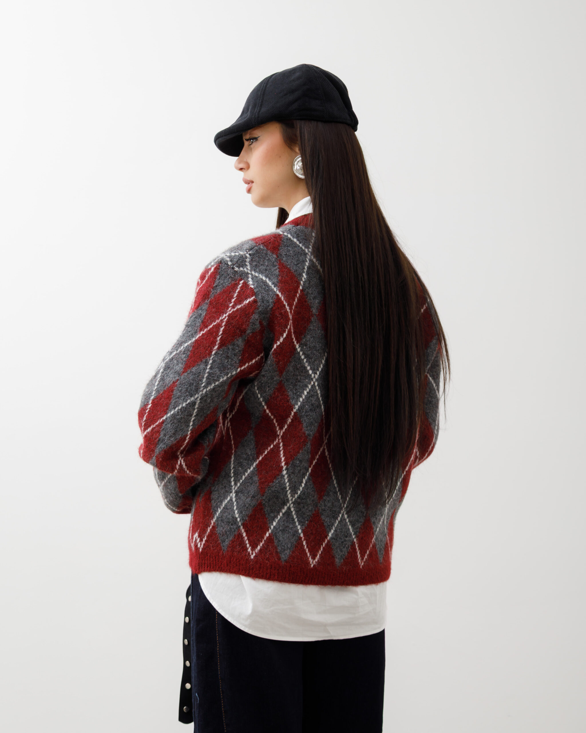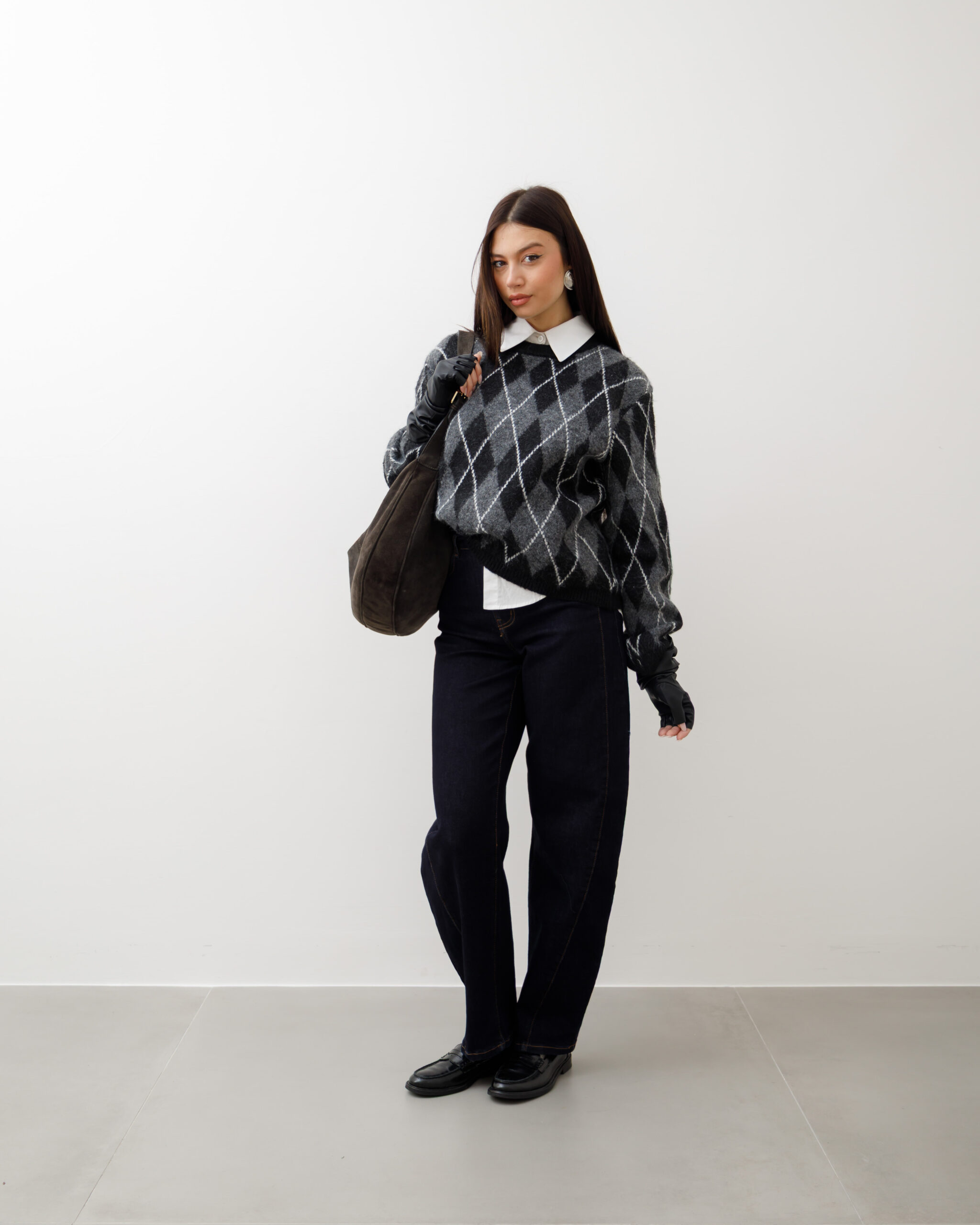 Maglione in misto lana, manica lunga, girocollo, trama a rombi, texture morbida, lunghezza regolare, elastico