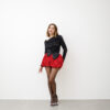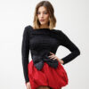 Minigonna a palloncino, vita alta, con bustino elastico, fiocco big in raso con strass removibile, elastica.