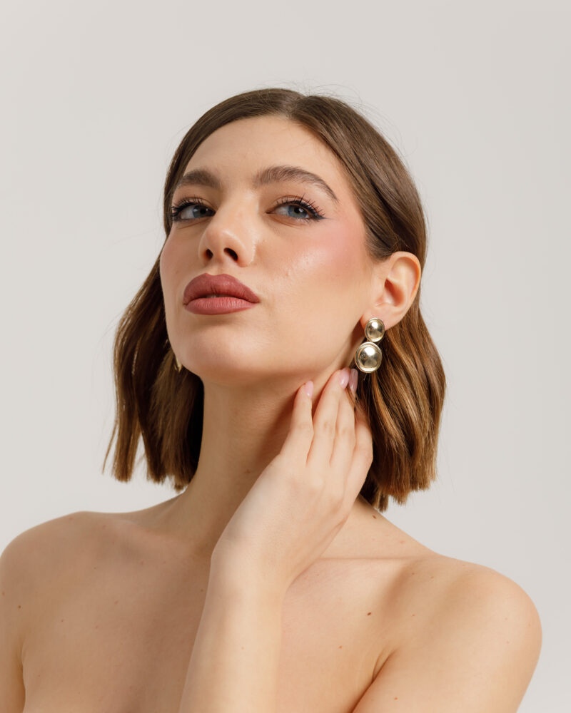Orecchini in metallo con finitura lucida, design dalla forma ovale allungata e leggermente bombata, con superficie liscia, chiusura con vite.