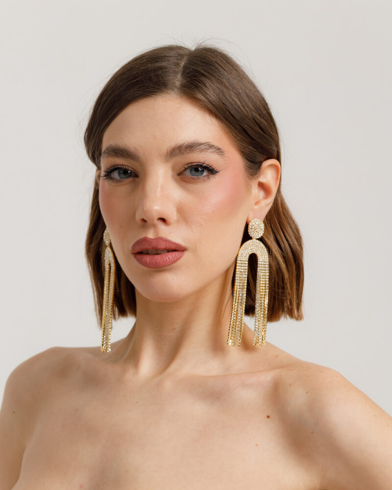Orecchini pendenti in metallo, impreziositi da strass. Il design è composto da una parte superiore circolare con pavé e da frange di strass cascanti, che creano movimento, chiusura con vite