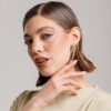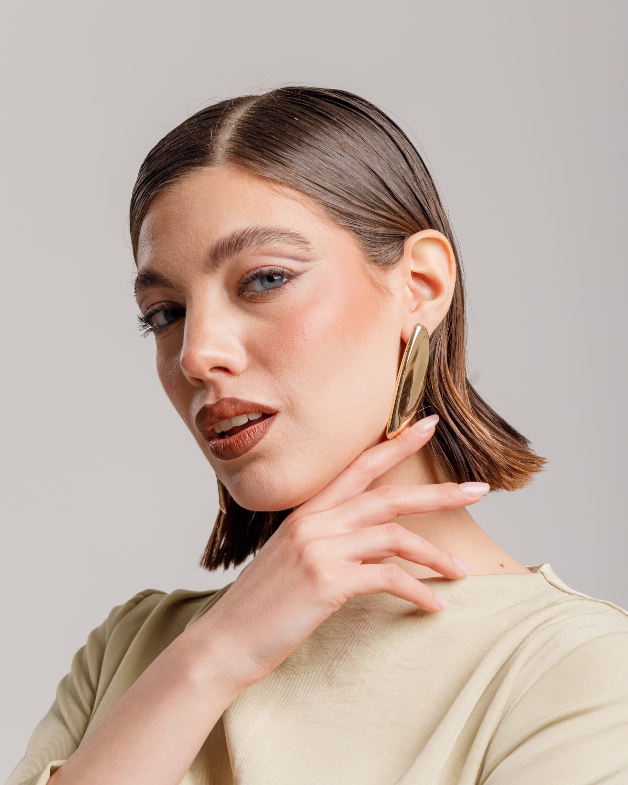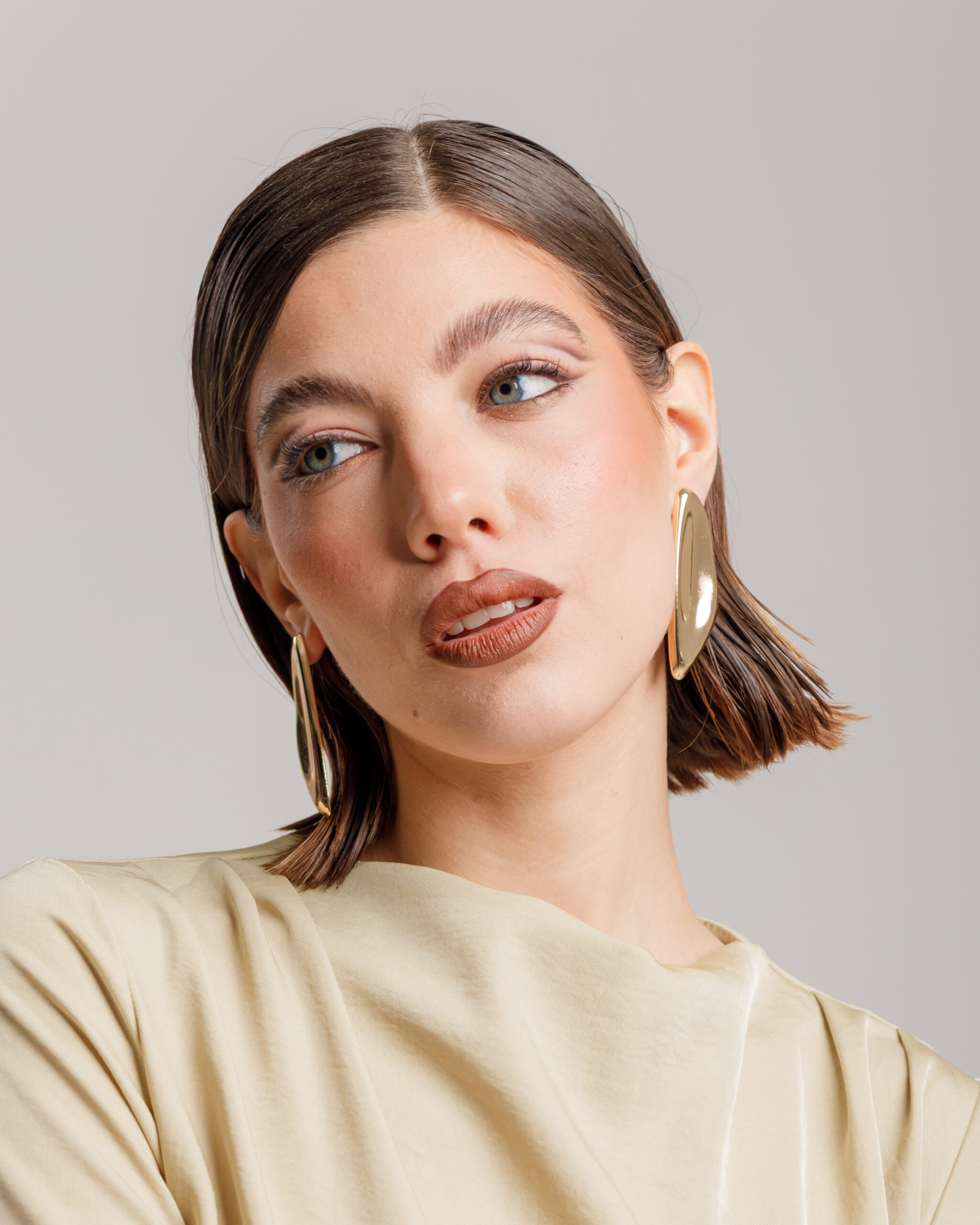 Orecchini lunghi, sagoma ovale, arrotondata e bombata su bordi, chiusura con vite.