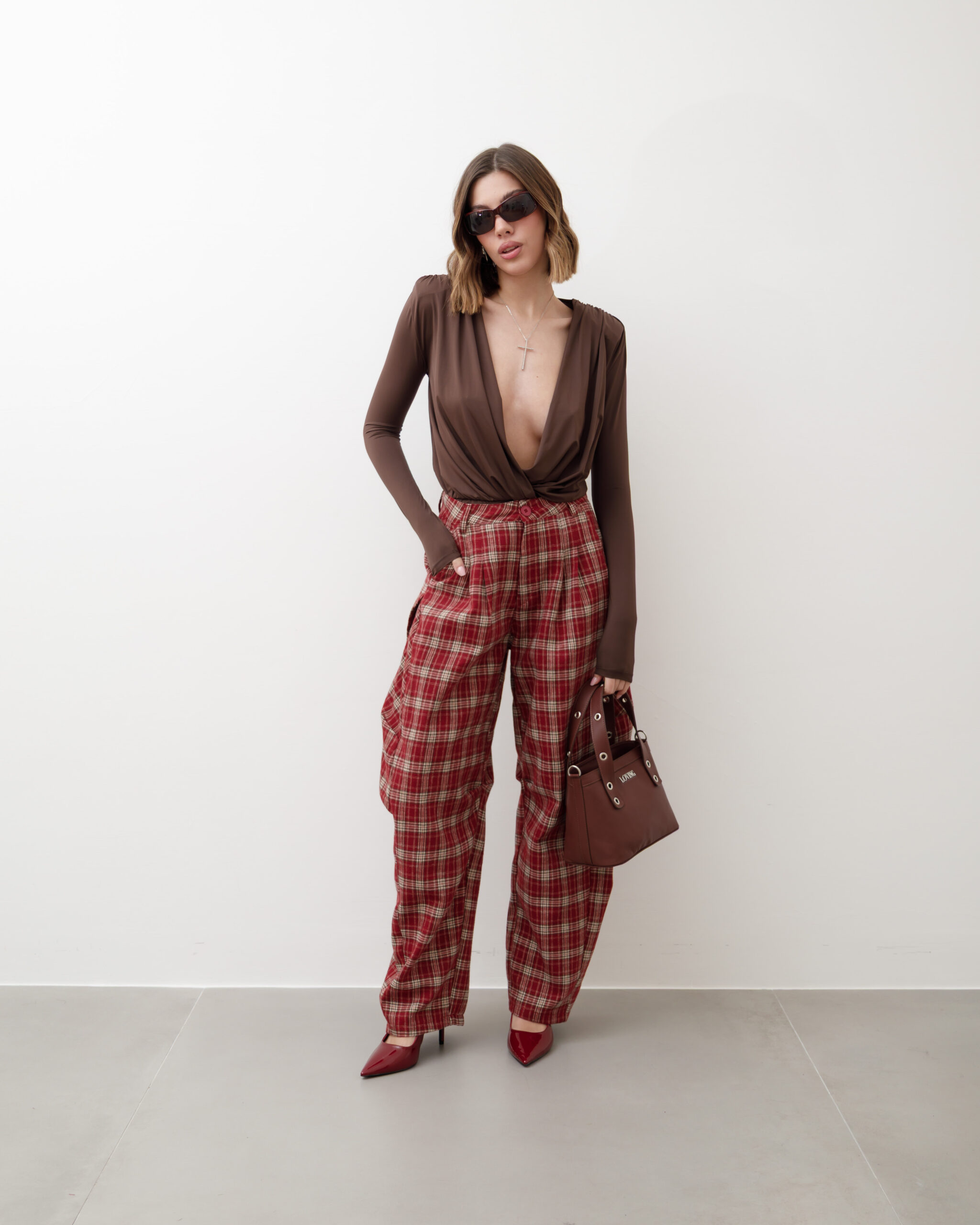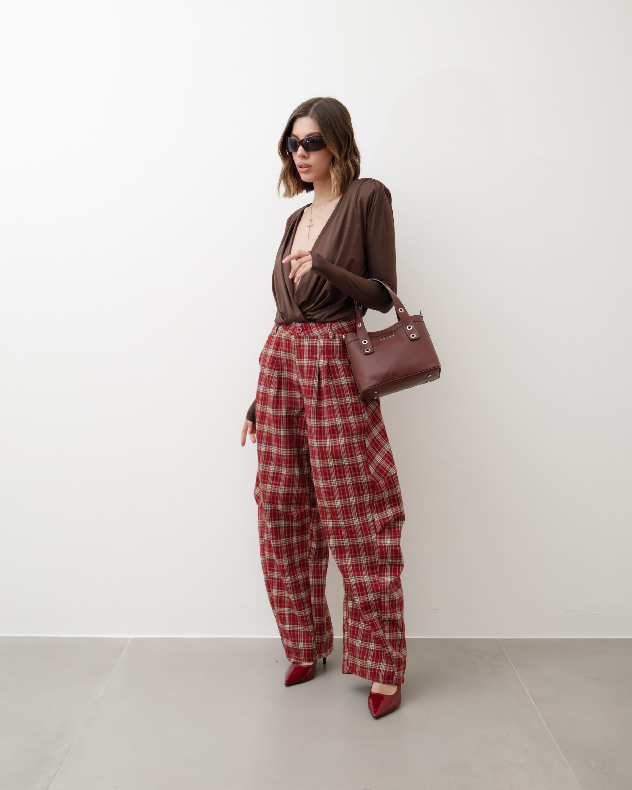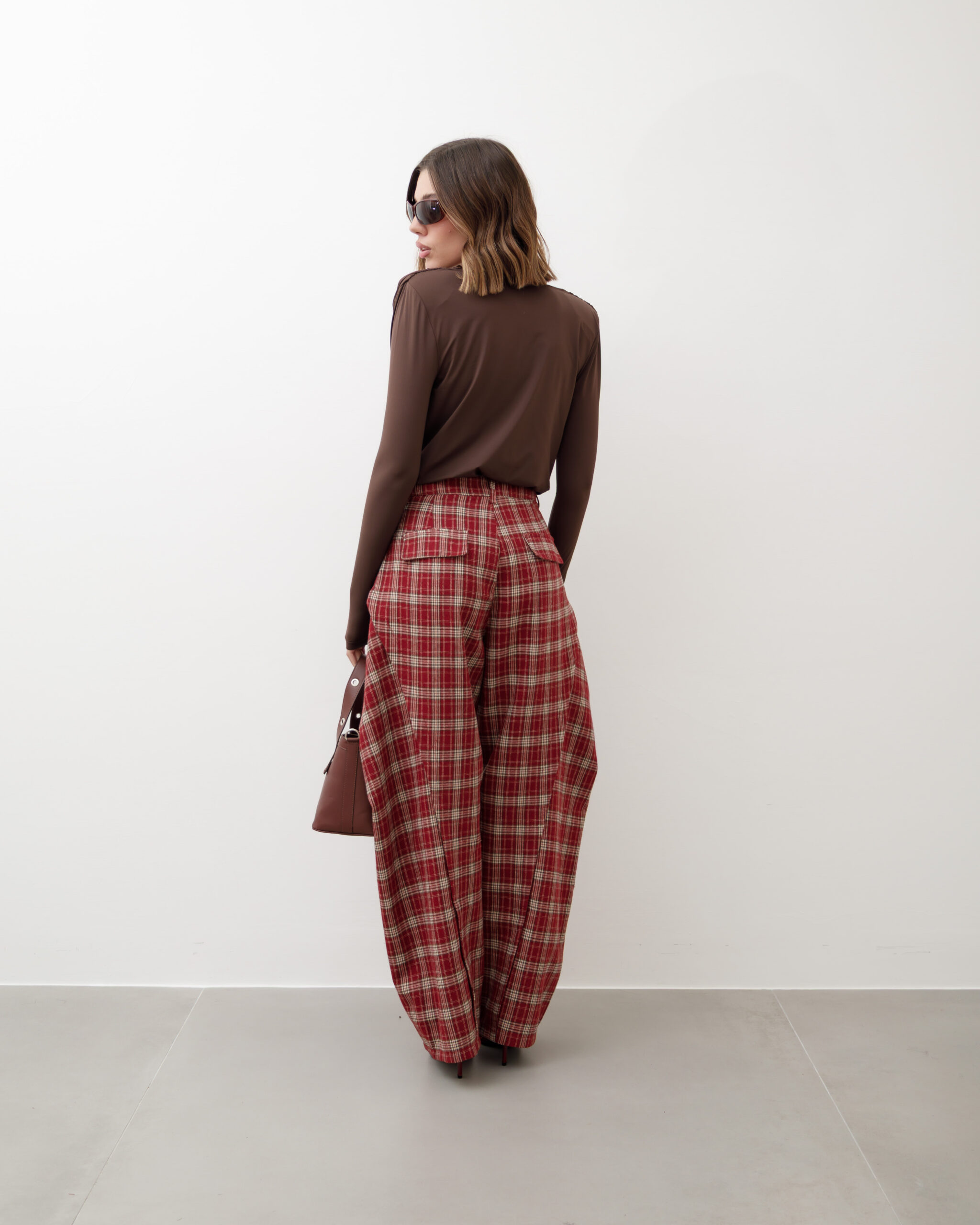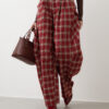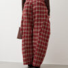 Pantaloni in cotone, vita alta, pinces frontali, modello ballon, stampa tartan, tasche a filo, gamba ampia, chiusura frontale con bottone e zip. Non elastico.