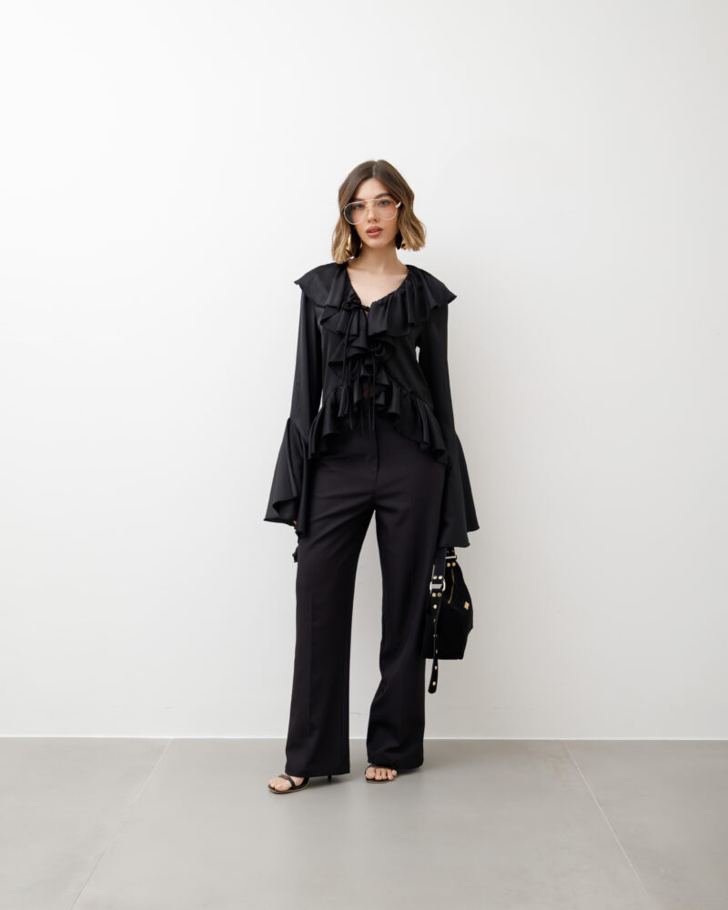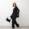 Pantaloni vita media, taglio maschile, gamba tubolare, cintura in finta pelle, estraibile, tasca a filo, chiusura con gancio e zip. Elastico.