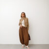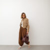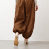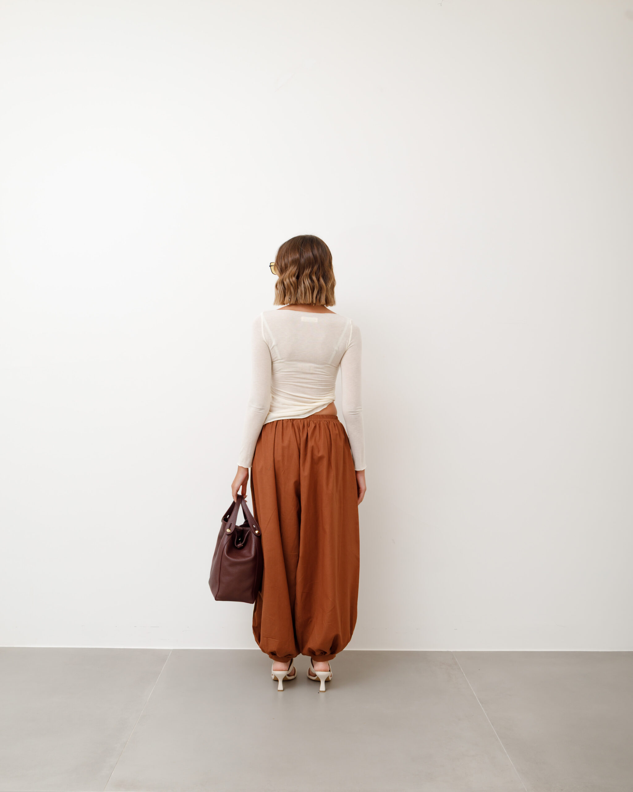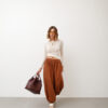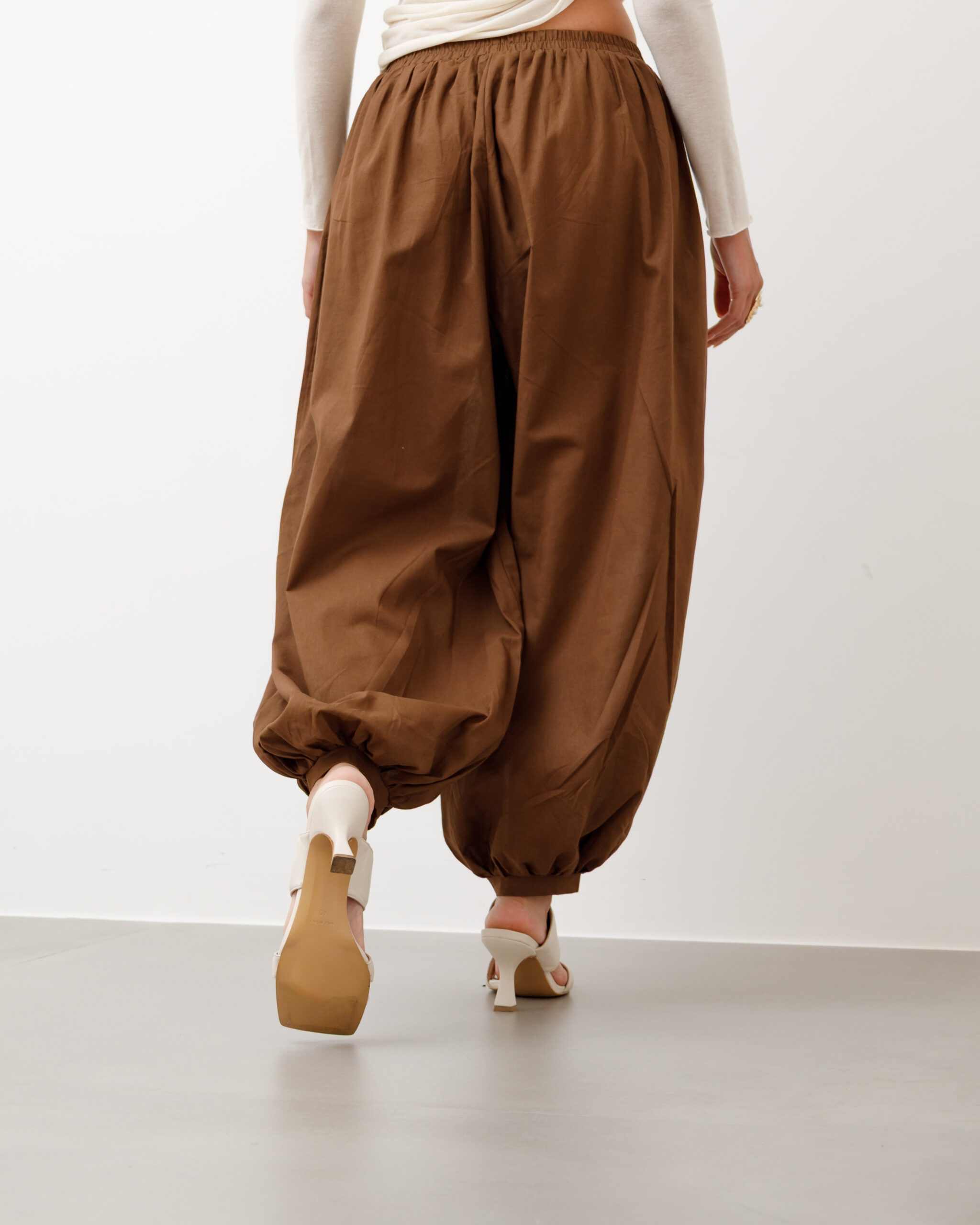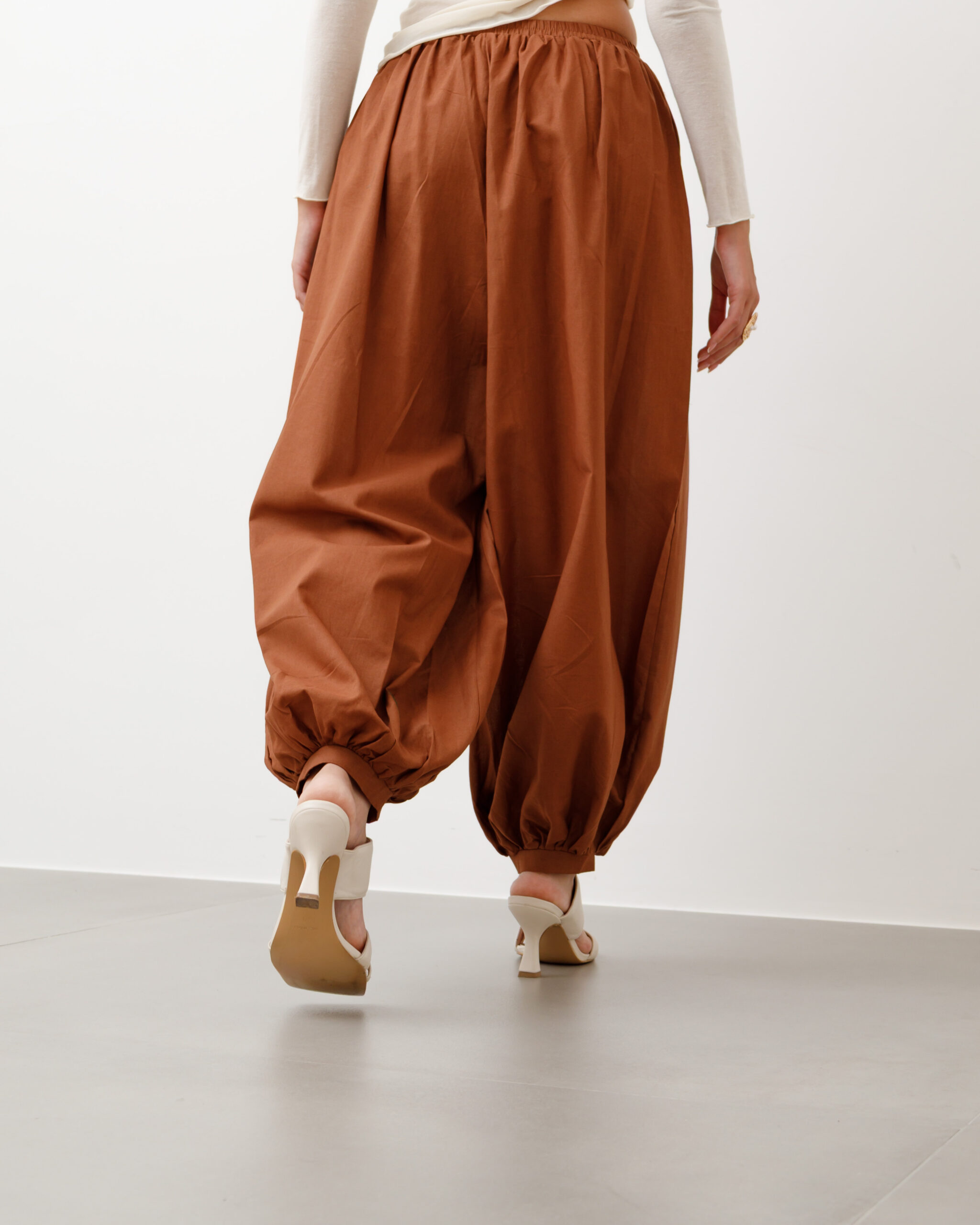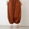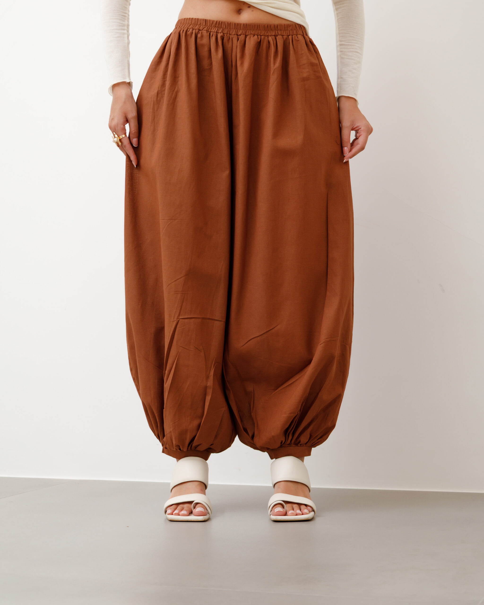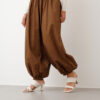 Pantaloni in lino, vita alta con elastico in vita, silhouette fluida modello ballon, gamba voluminosa, fondo stretto con orlo cucito. Non elastico