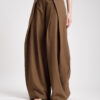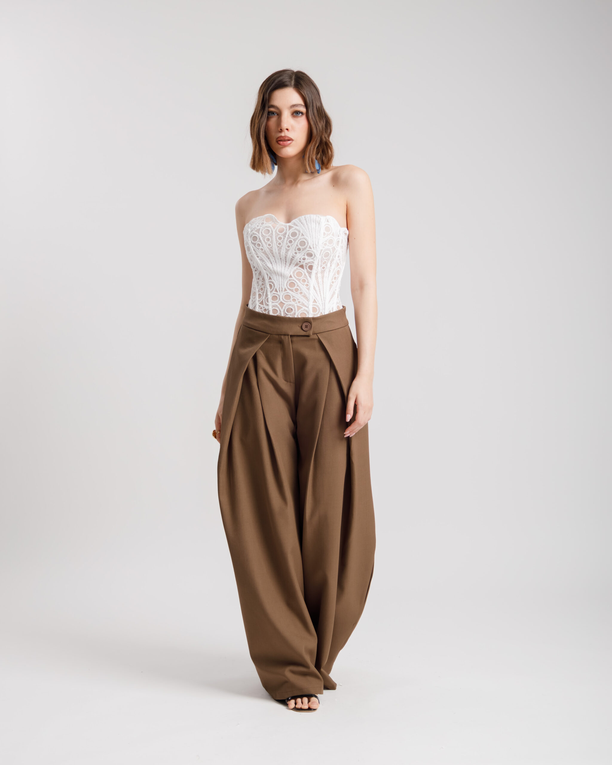 Pantaloni vita alta, modello palazzo, vita alta, strutturata, pieghe frontali che creano volume, gamba ampia, tasche a filo, chiusura con zip e bottone, non elastico.