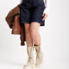 Shorts bermuda, vita alta, gamba regolare, cuciture a contrasto, chiusura frontale con bottone metallico e zip. Poco elastico