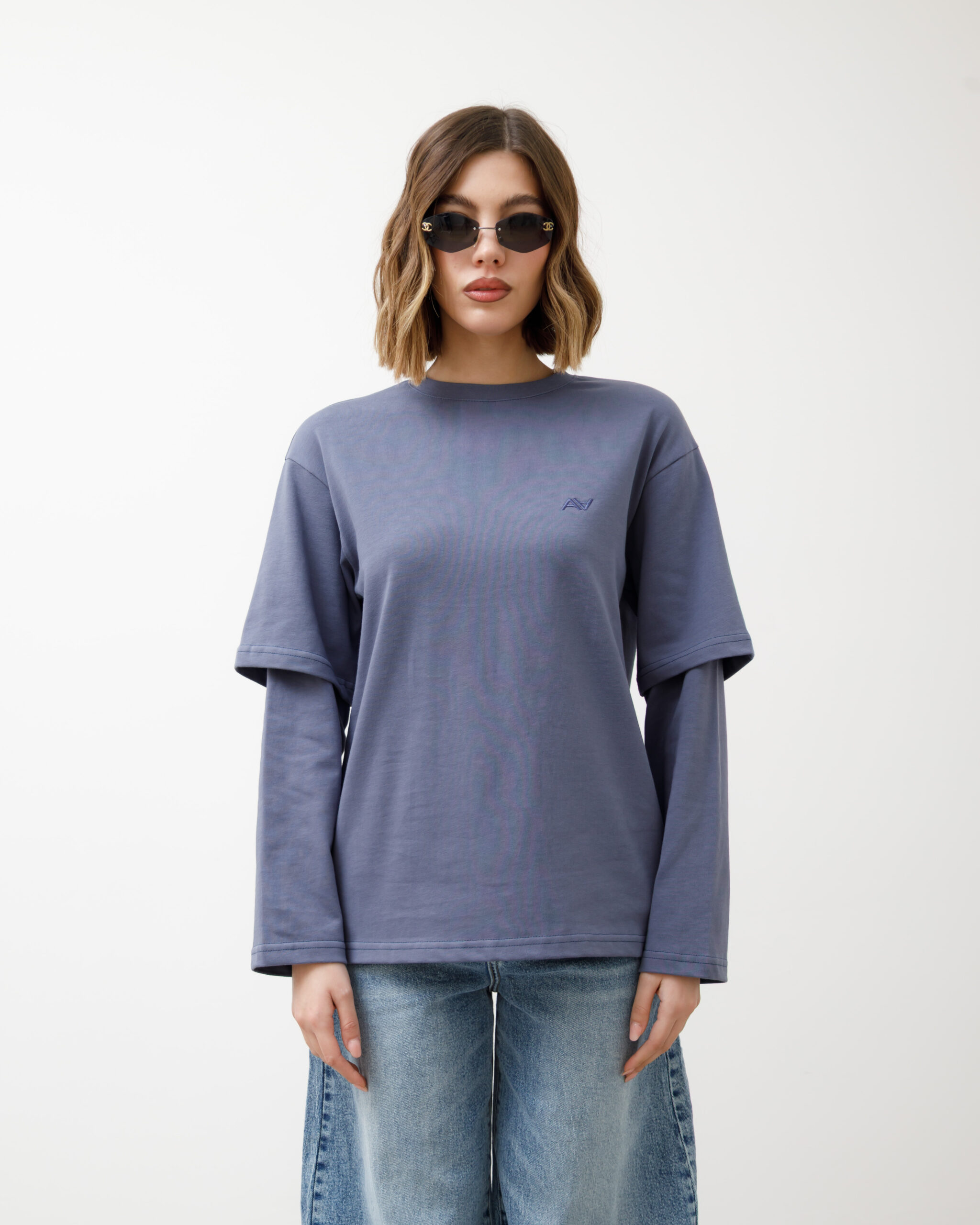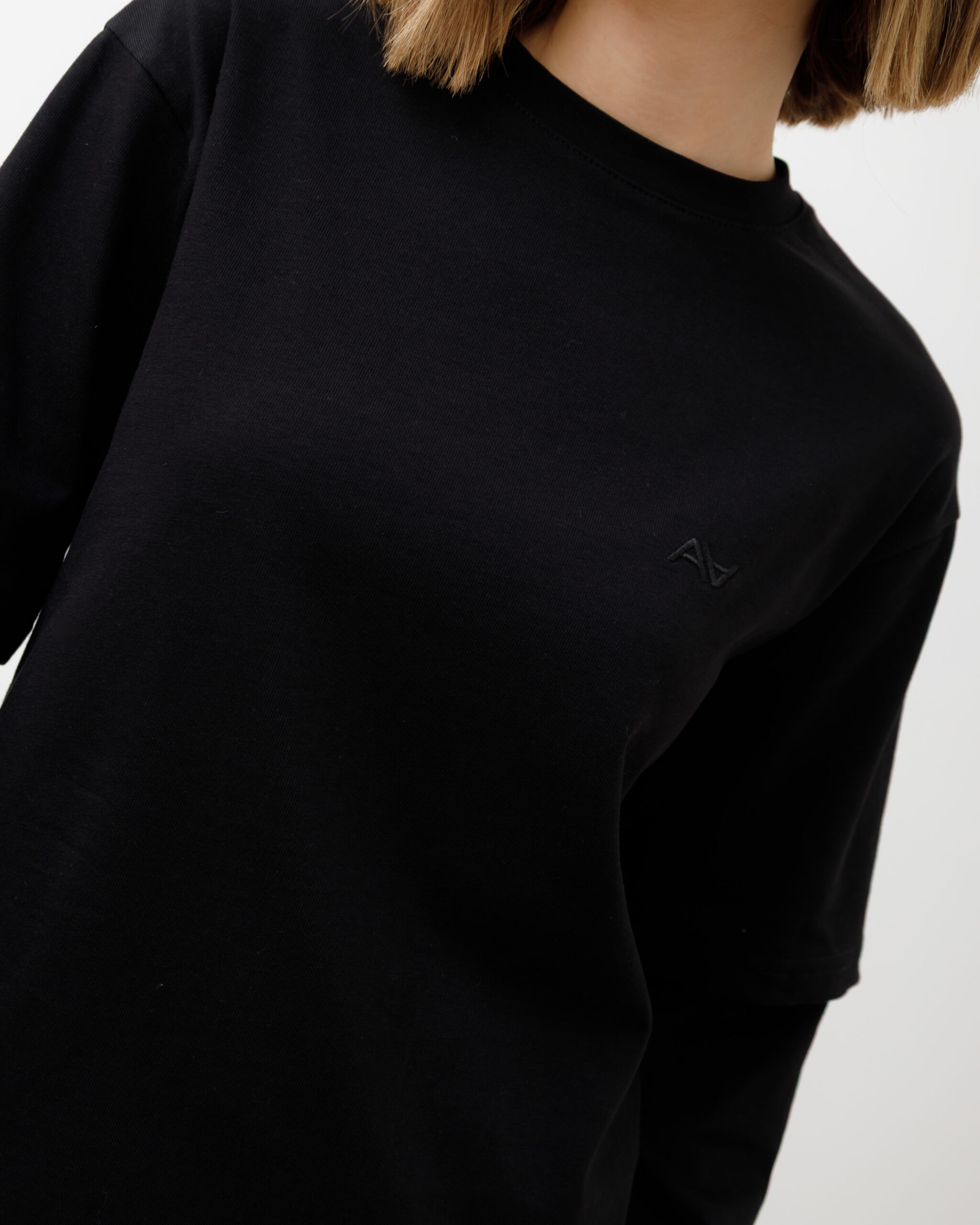 T-shirt in cotone corposo premium by ALTHÉA. Il capo è composto da un doppio strato integrato che crea l’effetto di una t-shirt a manica corta, sovrapposta a una maglia manica lunga, girocollo, logo su petto ricamato tono su tono, spalla leggermente scesa. Lunghezza regolare, non elstica.
