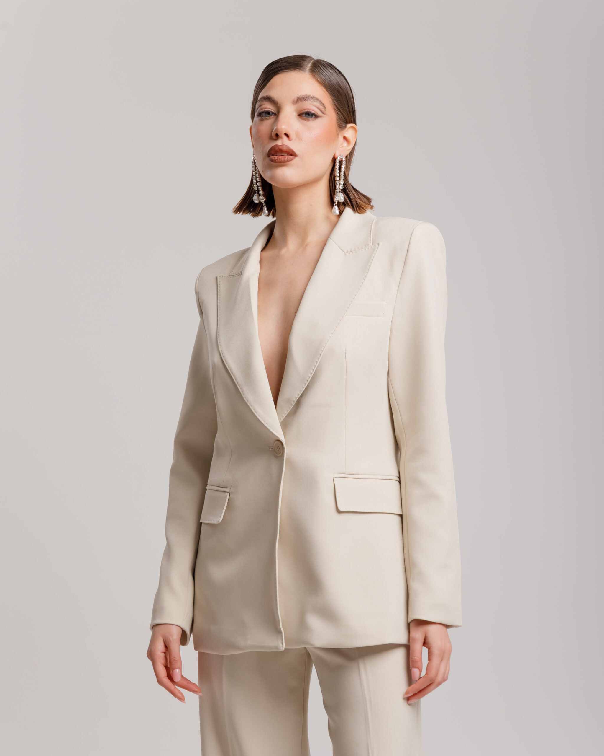 Tailleur sartoriale composto da blazer monopetto, manica lunga con spallina strutturata, rever classico e vestibilità slim, tasche frontali. PantalonI a vita media con gamba tubolare e caduta fluida, tasche a filo, chiusura anteriore con bottone e zip, elastico, foderato.